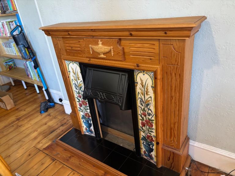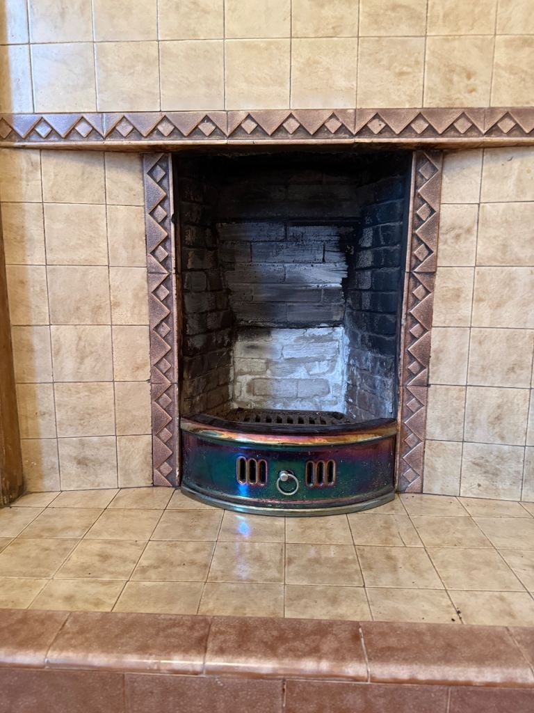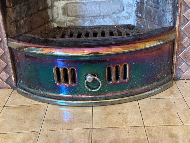 The Lustre Ware Cast Iron Fire Front Fret is a vintage original piece from the 1930s, with simple Art Deco styling. This antique fireplace accessory is made of iron and cast iron, showcasing a multi-iridescent colour palette that adds a touch of elegance to any fireplace. Reclaimed and carefully crafted, this fret is a unique and stylish addition to any home looking to enhance the charm of their fireplace. Small chips and flaws as per photos. Perfect for many of the remaining fireplaces of EH5.