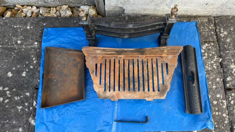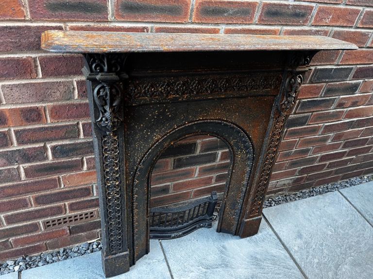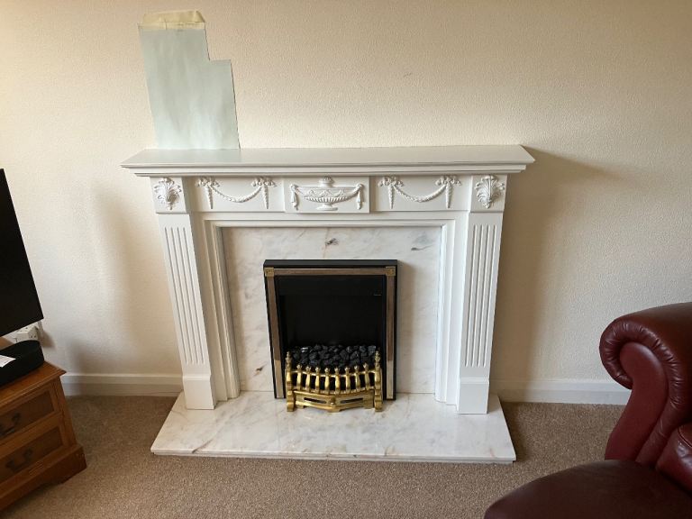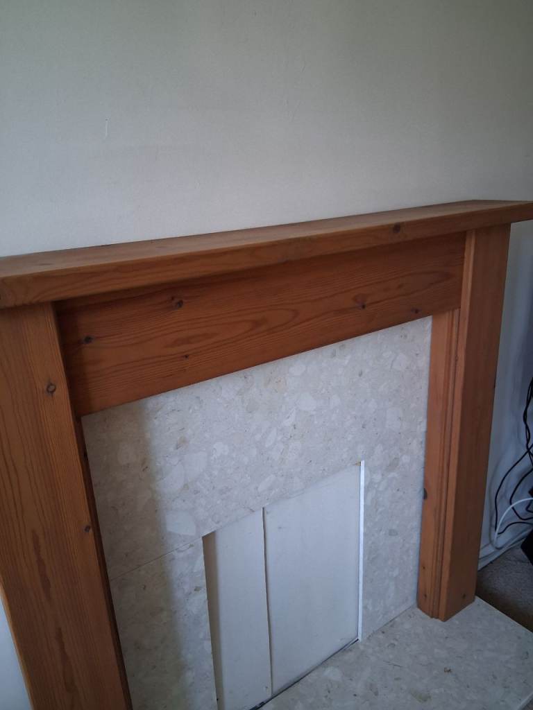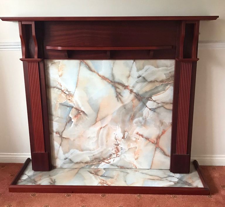 Brand new pale pink/beige marble fire surround, still in packing. Dimensions 940mm overall height, 571.5mm height of gap, 419mm width of gap, 260.5nm width of each side panel