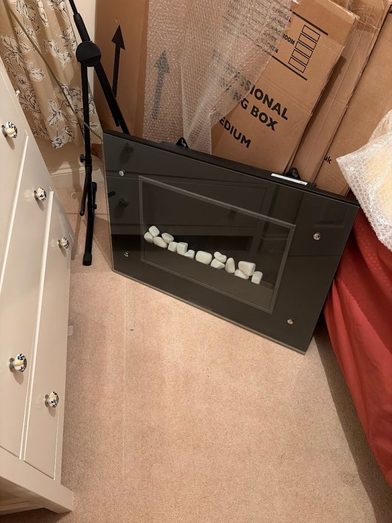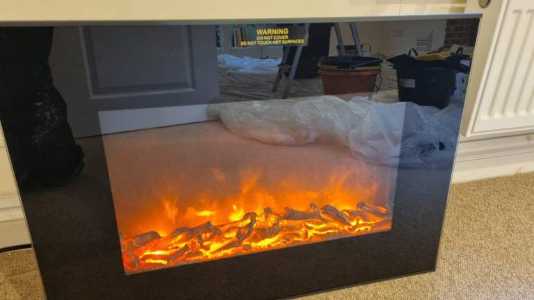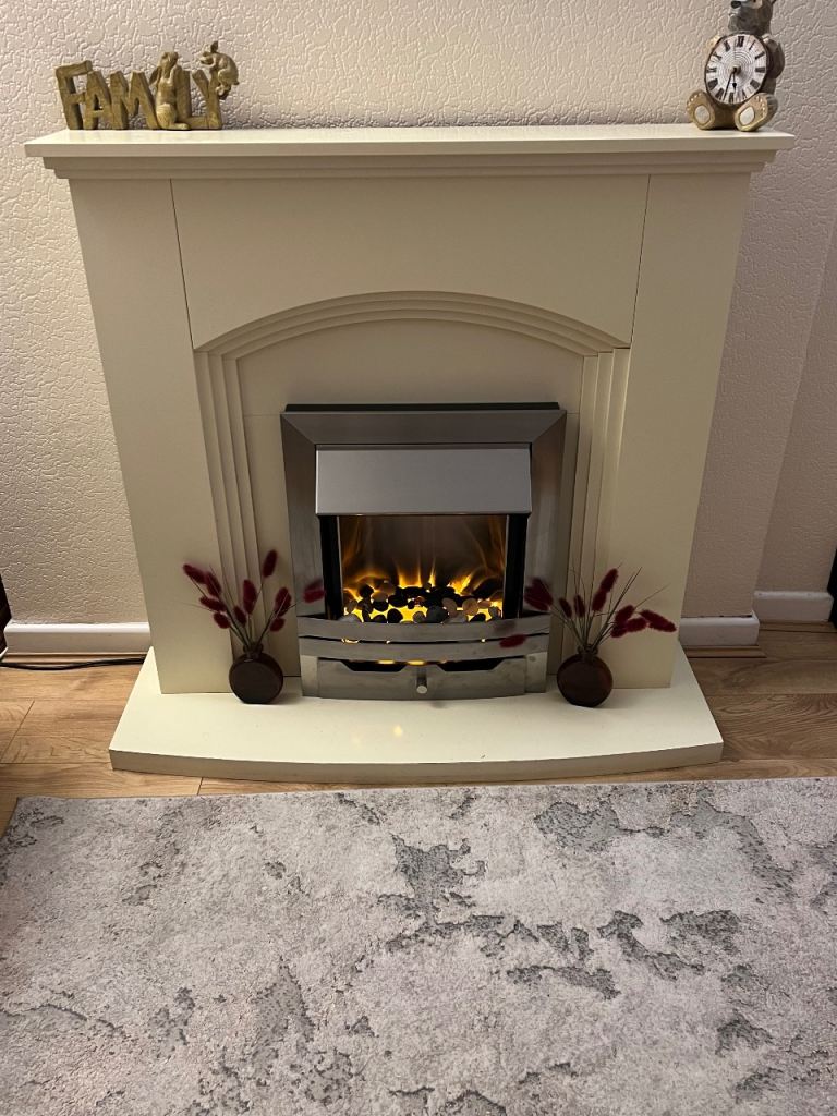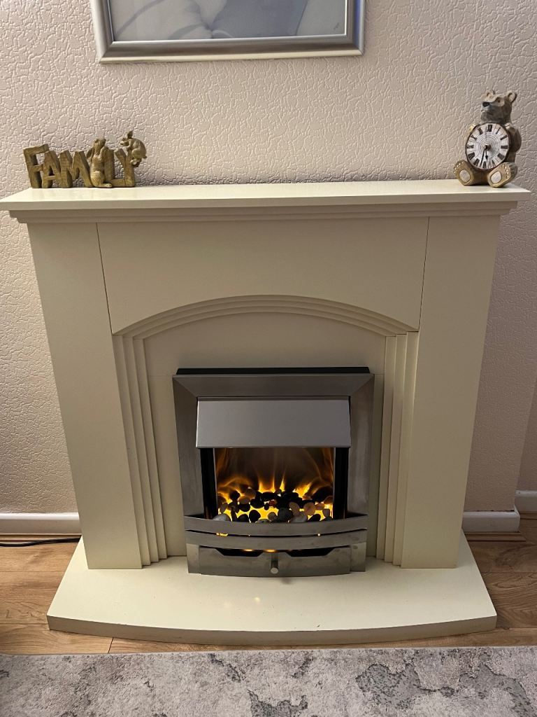 Lovely fire surround with silver electric fire from B and Q… firelight only feature also + two heat settings, works perfectly, only really used it for the glow, comes with the stones for the center or you can customise it with your own.