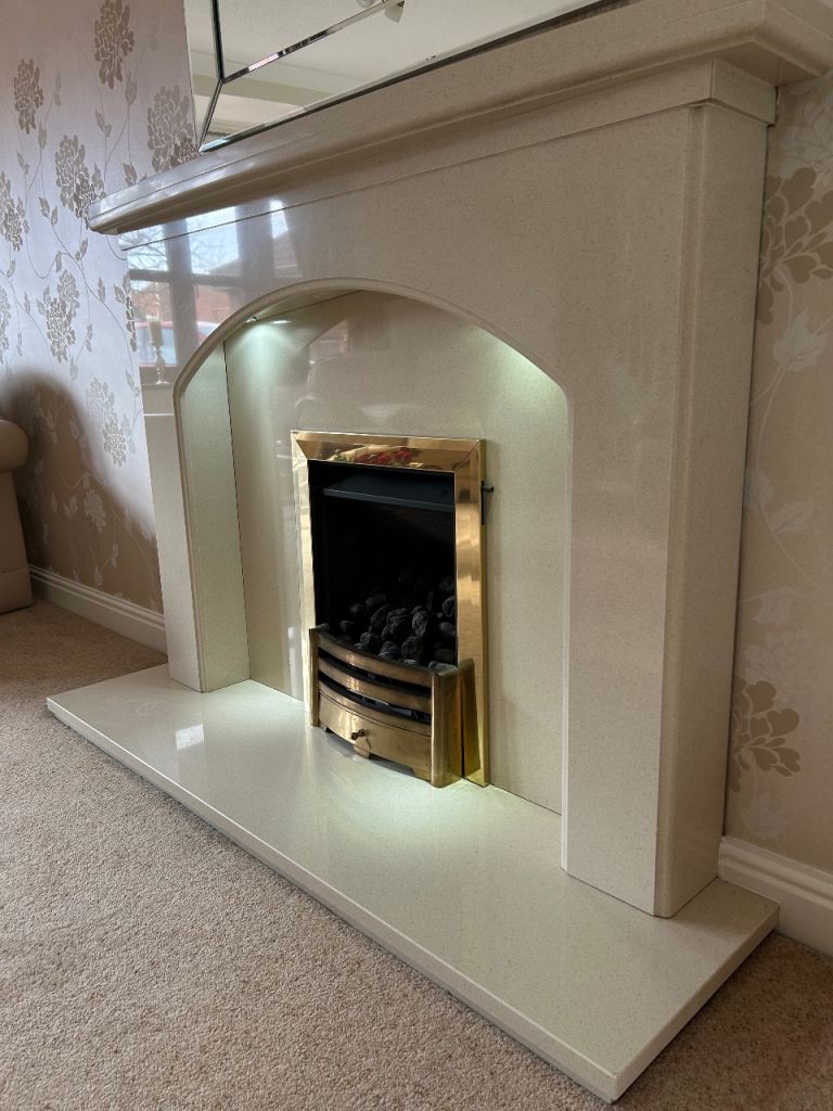 Flecked beige Micromarble fireplace for sale c/w integral hidden lighting.