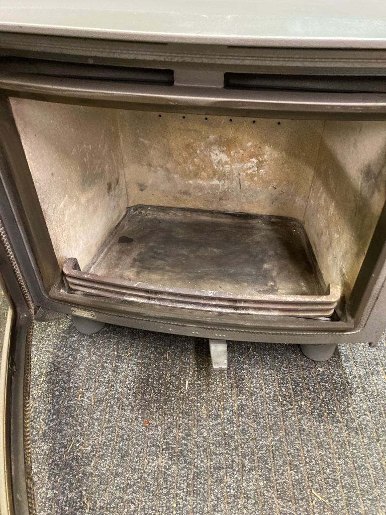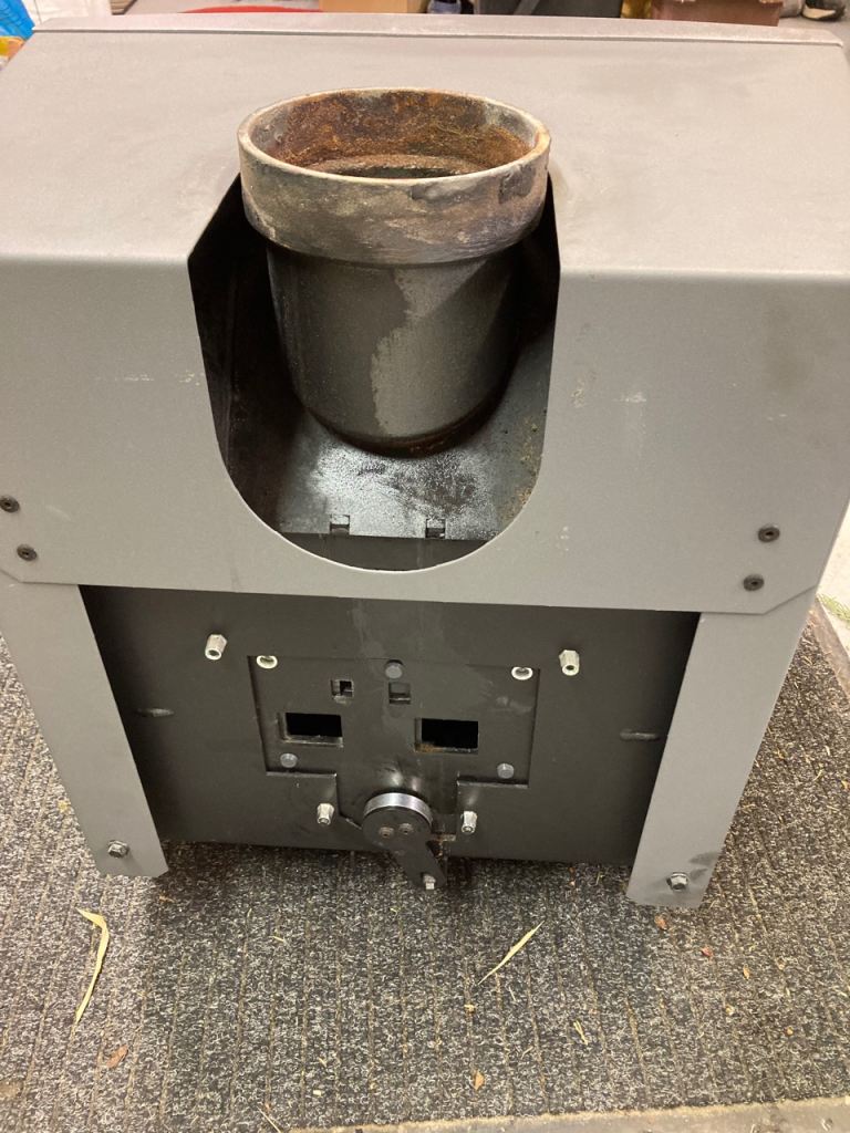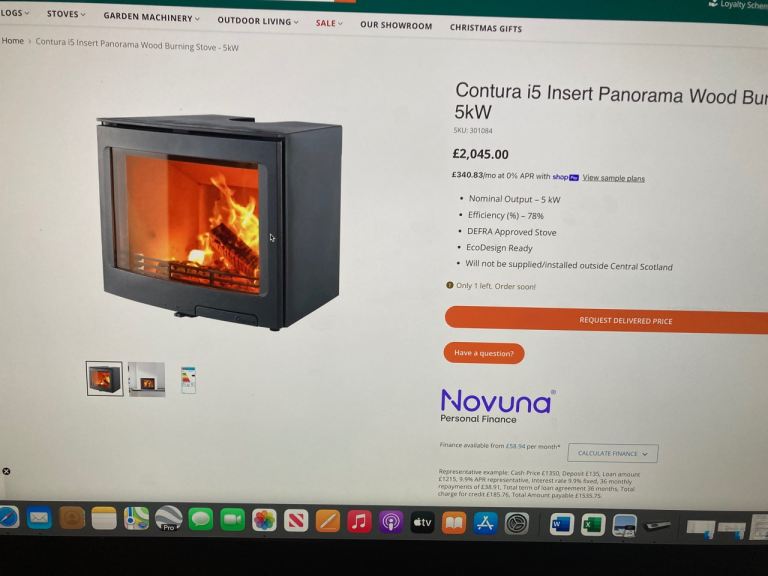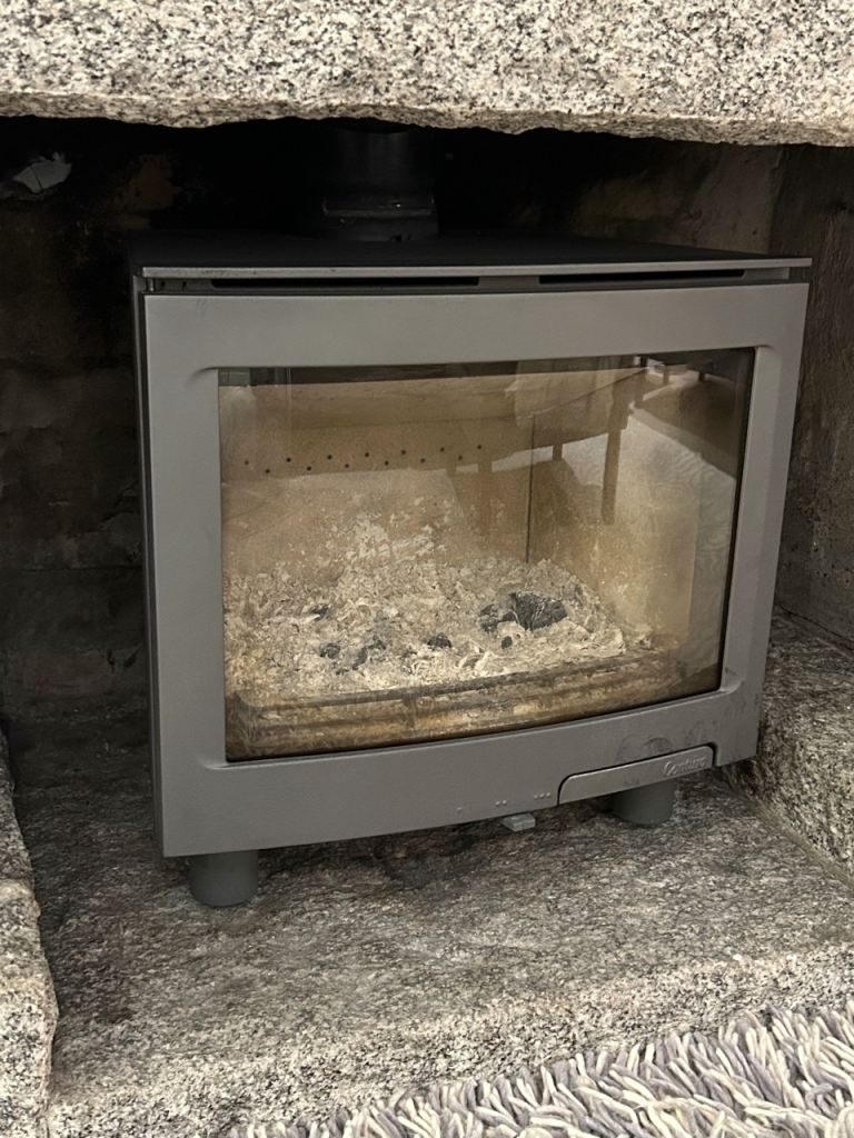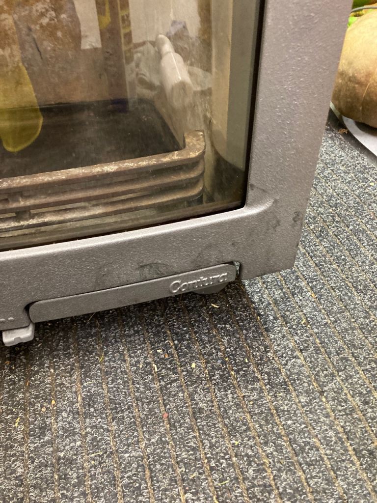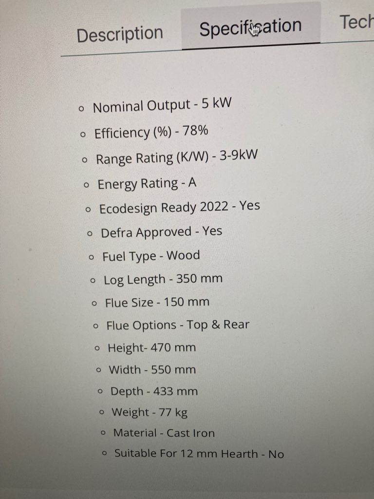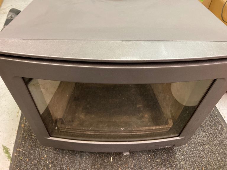 Modern looking wood burner (see full specifications on second photograph - 5kw output, panoramic door) Still a current model, retailing for over £2k. We have changed this recently for a smaller stove as this was giving out too much heat for the size of the room! Works really well, some minor marks on it as shown in photos. Collection only from Bridgend area. Cash on collection.