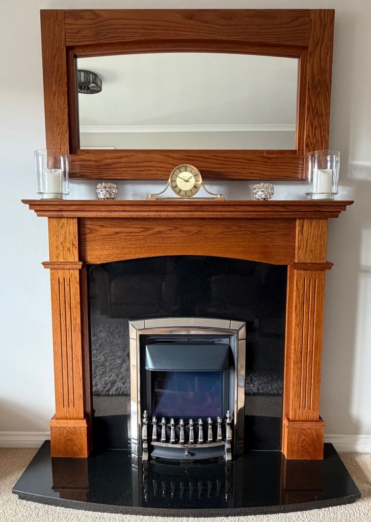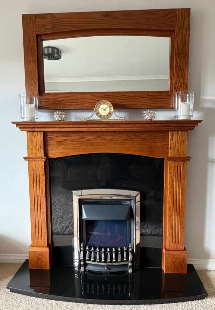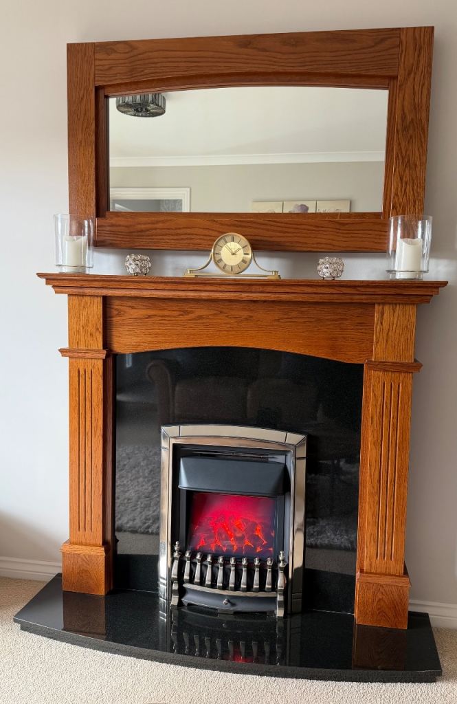 Electric fireplace with surround, black granite hearth and matching mirror, excellent condition.