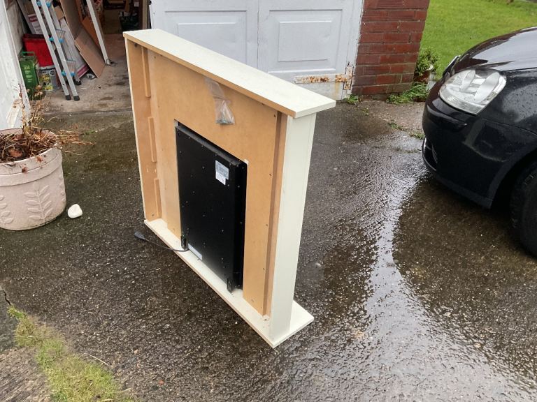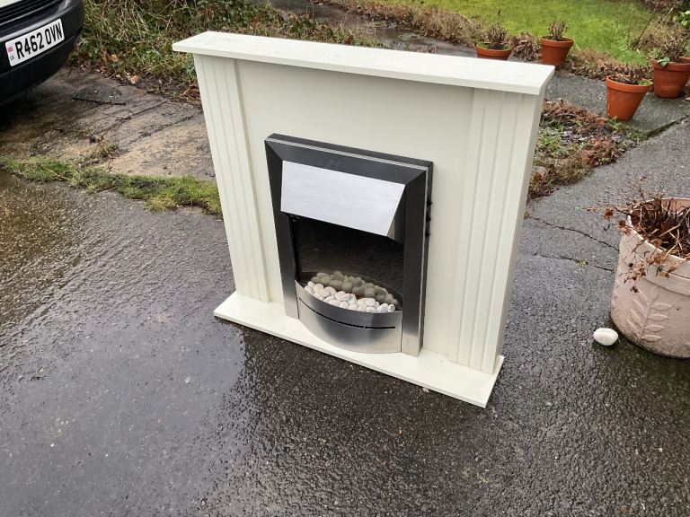 A freestanding electric fan heater with live flame effect display. White surround approximately 930 mm wide and 870mm high. Comes with three pin plug connection.