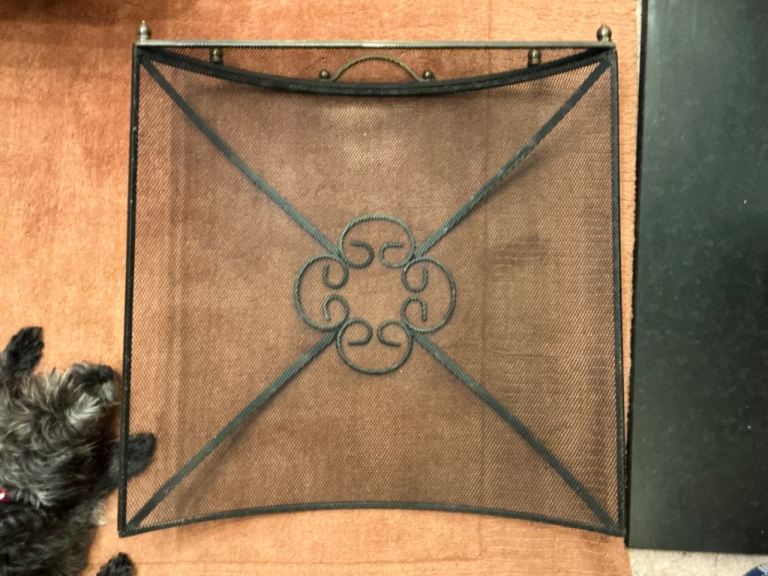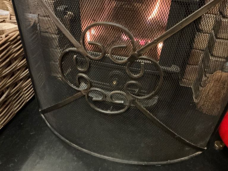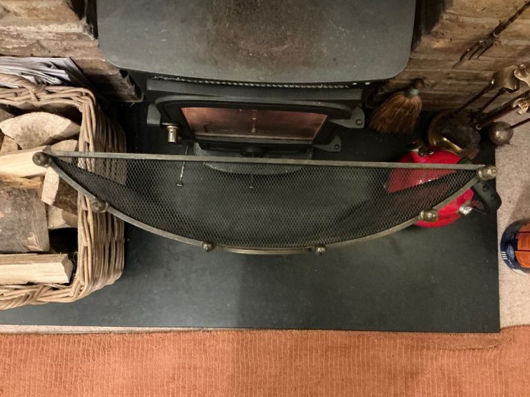 It has a floral type pattern in the centre with decorative brass nobs on the top. Unlike many other designs it has an enclosed top so also stops any errant sky bound sparks.