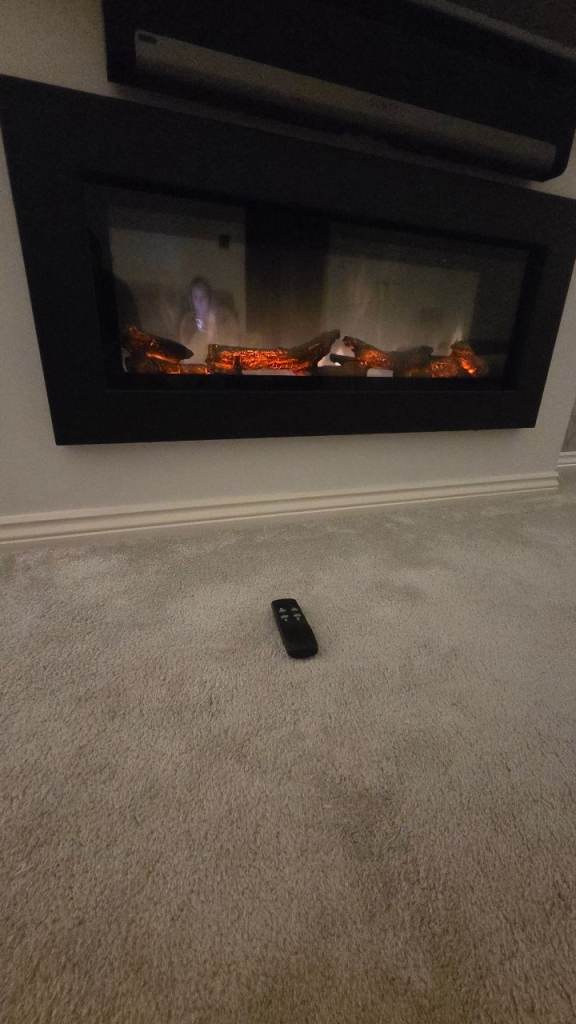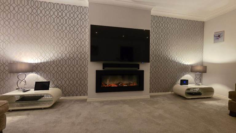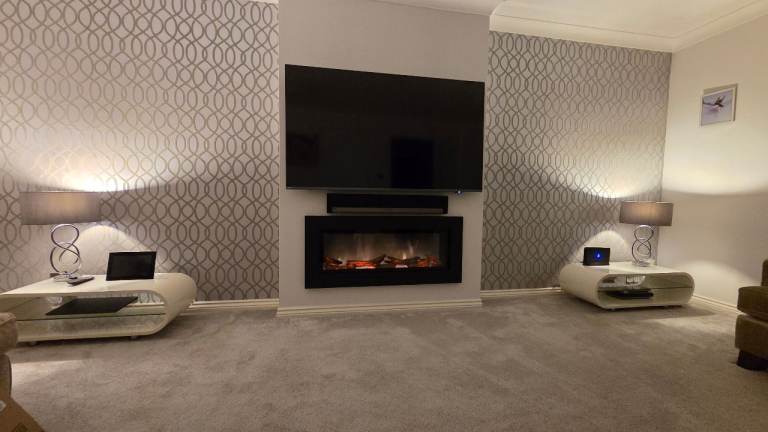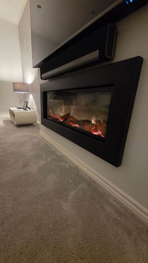 Dimplex optiflame recess fire for media wall with 2kw heat output as an extra option.