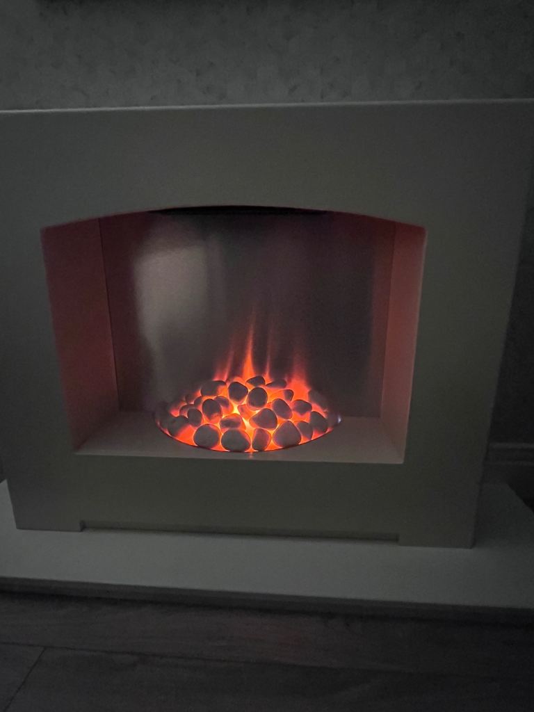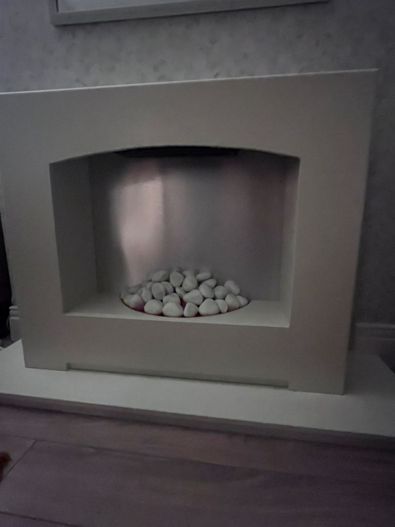 Next electric fireplace cream colour and silver background, in good condition no scratches or marks and the heating still lights up and works, bought for £400 original