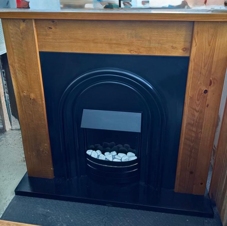 Stylish electric fireplace from NEXT with a natural wood surround and black cast‑iron style insert. Gives a cosy, realistic flame effect without the hassle of a real fire. Great statement piece for a living room, bedroom or rental property.
