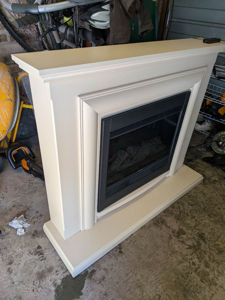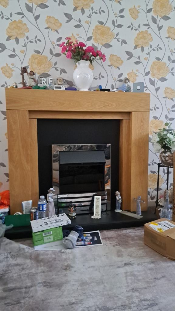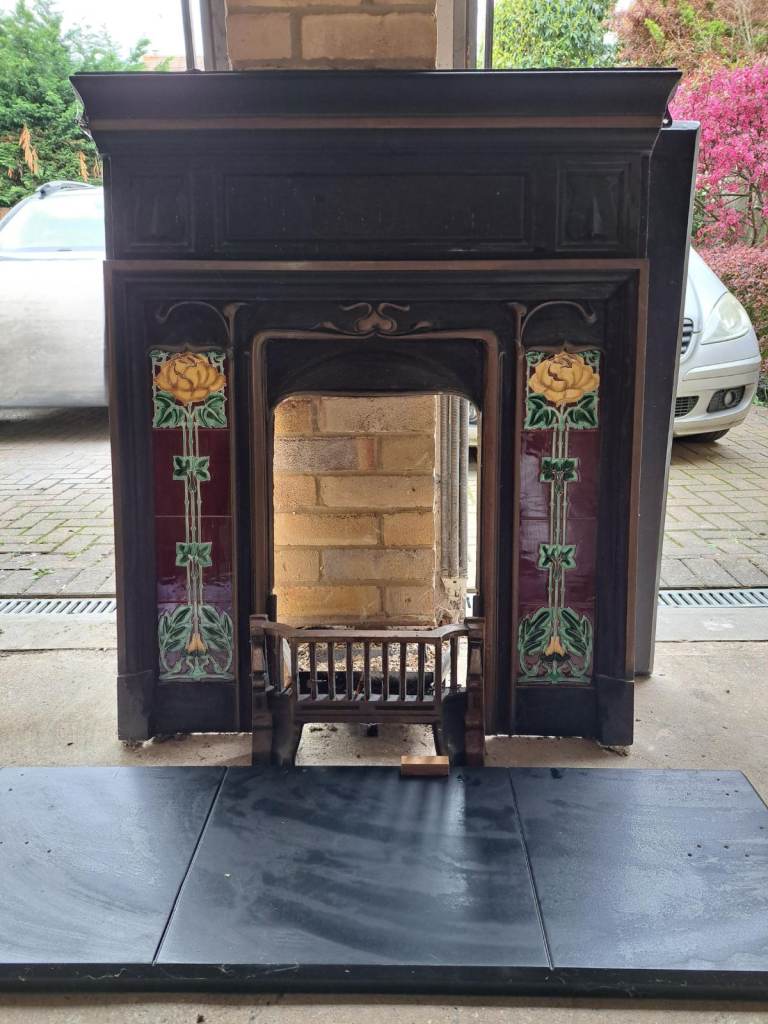 Gorgeous black metal and tile inset reproduction (Victorian/Edwardian style) fireplace surround with mantlepiece and hearth.