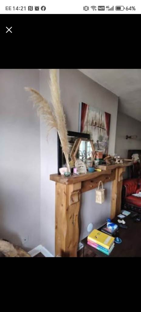 Solid oak cottage style fireplace surround. 122 cm high, 150 cm wide, opening inside 92 by 92 cm. 17 cm deep. It's solid and heavy, will need a van to collect.
