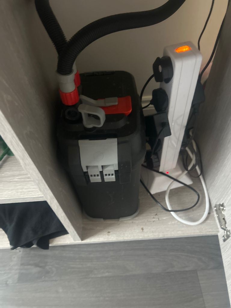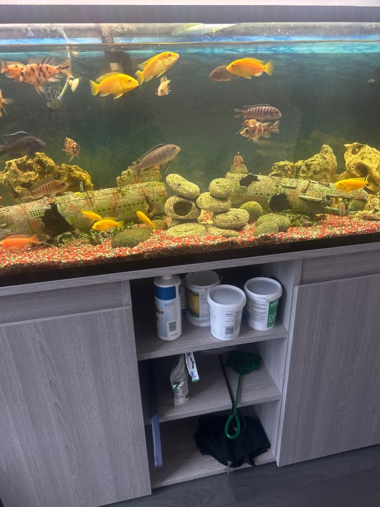 4ft fish tank with a fluval external filter, rocks and decor comes with a mix of Malawi cichlids, there’s a small crack in one of the glass panels, selling due to no longer having the time to care for it.