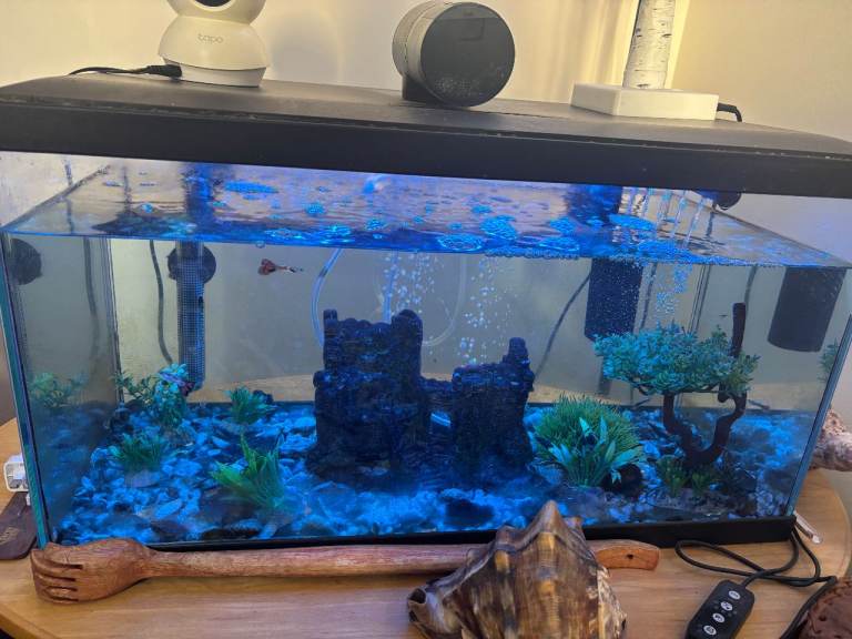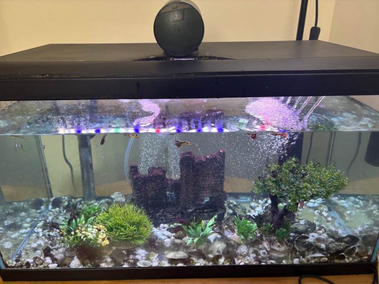 Selling all equipment and fish. Comes with fish (guppies) around 20, auto-feeder, heater, filter, stones, plants, food. Collection ONLY.