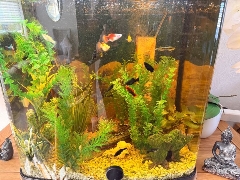 Fully established aquarium tank (84 litres) with approximately 20 tropical fish of various types and all accessories. Ideal starter tank. Lots of artificial plants and ornaments included. No longer able to look after it properly.