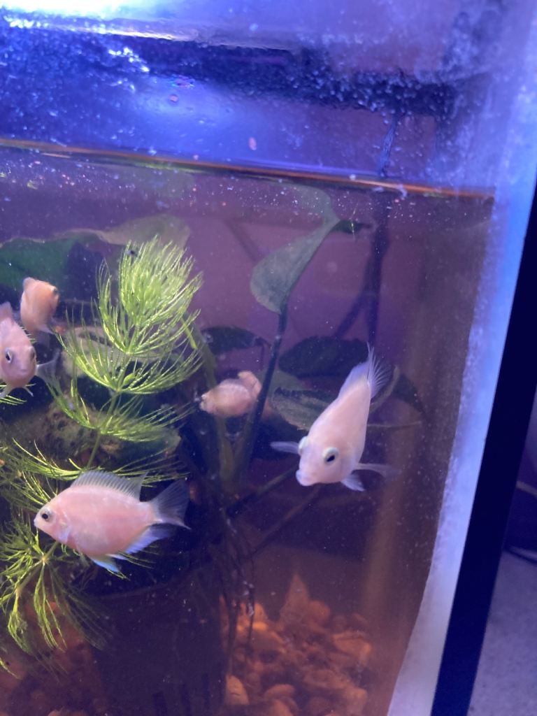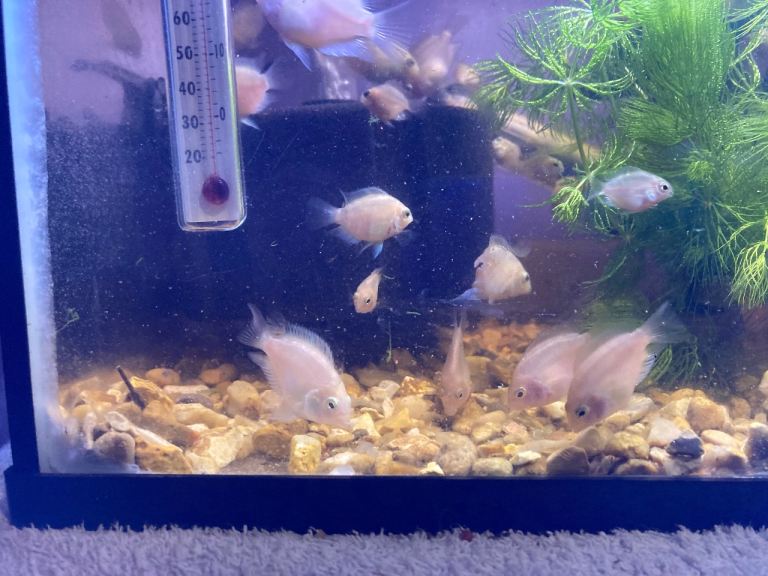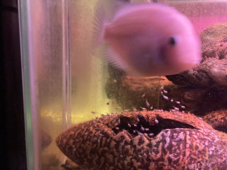Hi have 2 batches of baby platinum parrot fish first batch ready to leave all eating well and healthy pictures are of parents recent photos of babies approximately 1 inch in size not sexed at this stage but some are bigger than other which presume to be males just message for more info home bred babies usually available