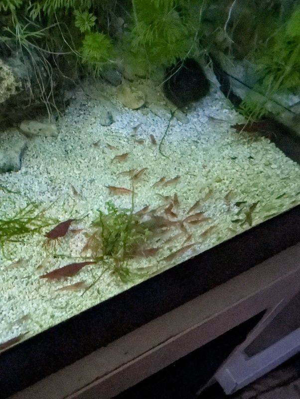 Cherry shrimp, babies at the moment but grow fast. Perfect addition to any aquarium, brilliant for cleaning algae and surplus food fish miss. Also perfect as a group on their own. £1 each