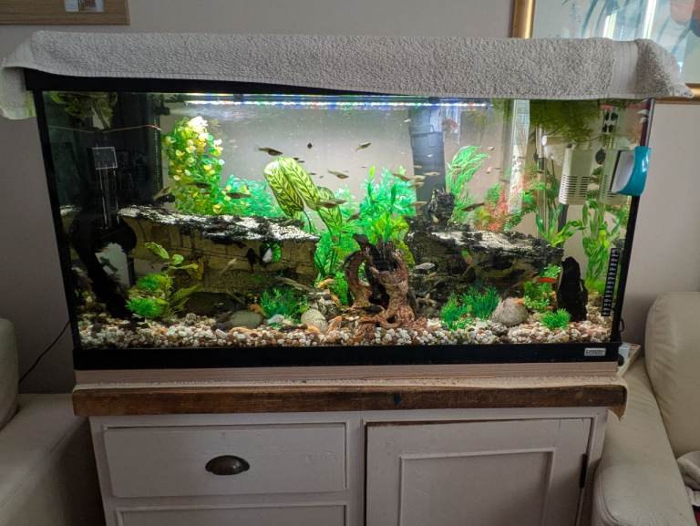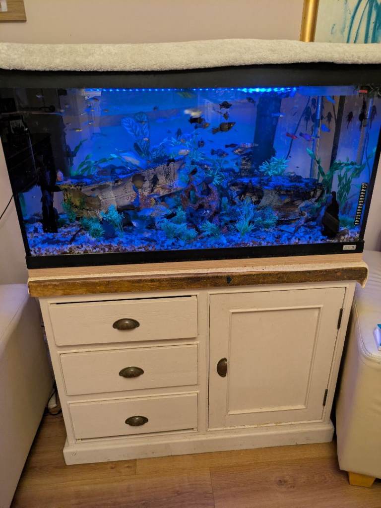 Also includes food, spare gravel, holiday feeder, water syphon and cupboard