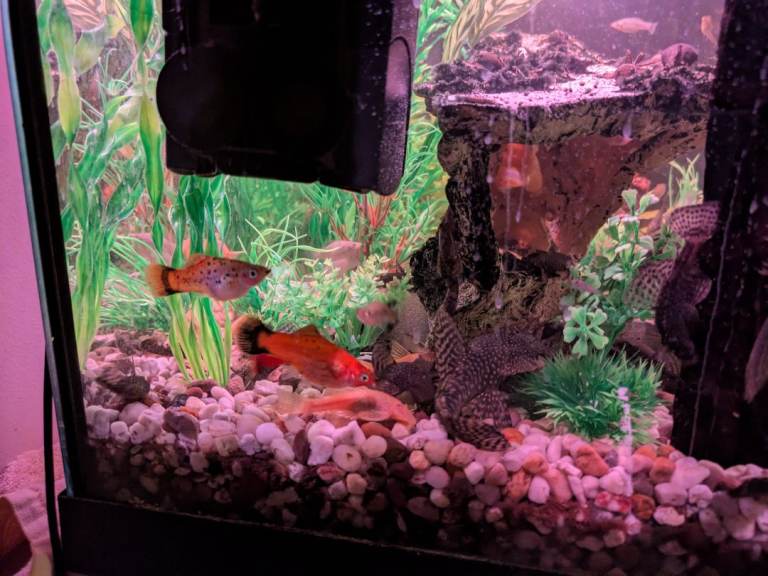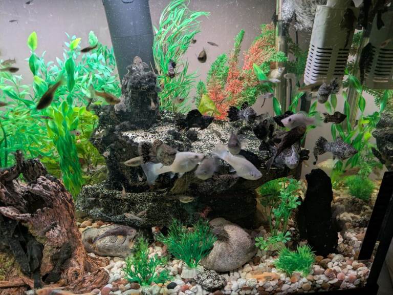 Various fish including plecos, molly's. guppies
