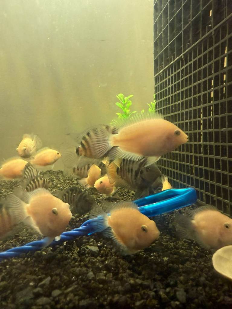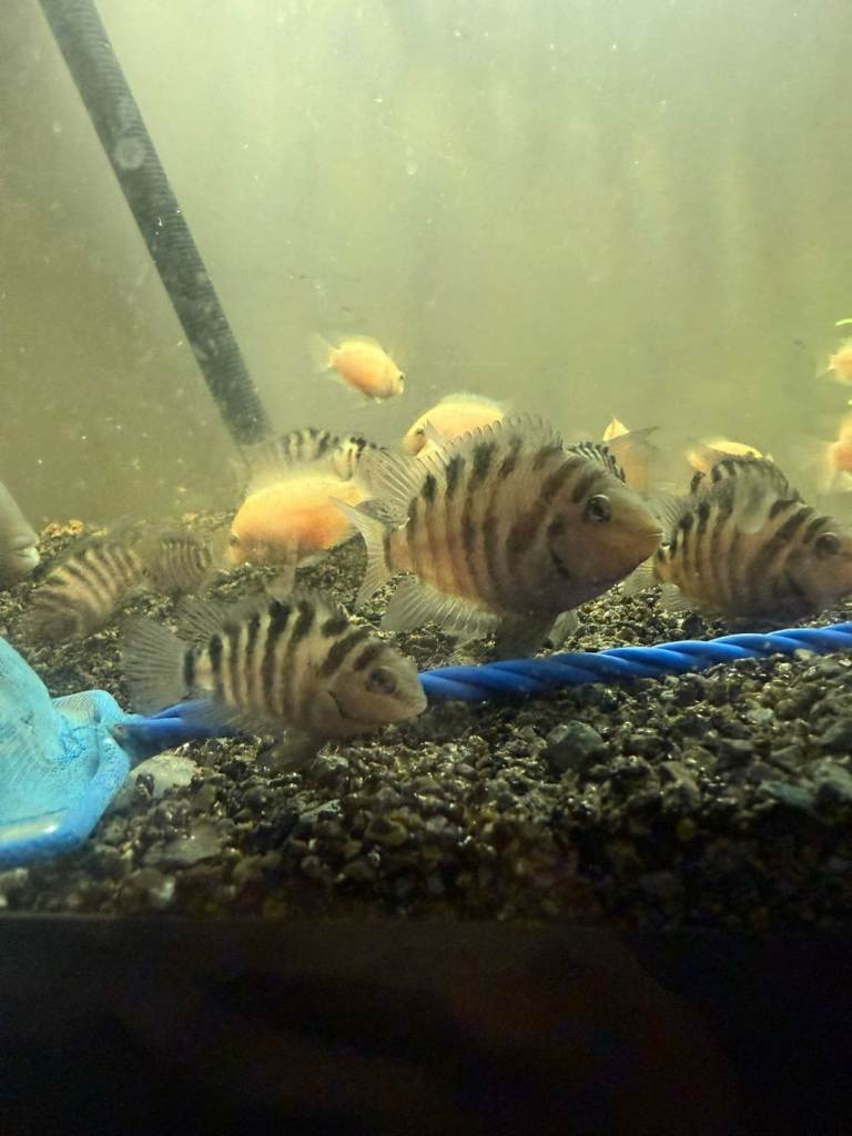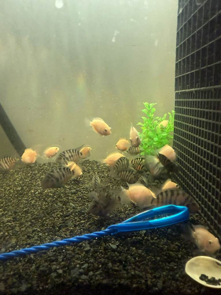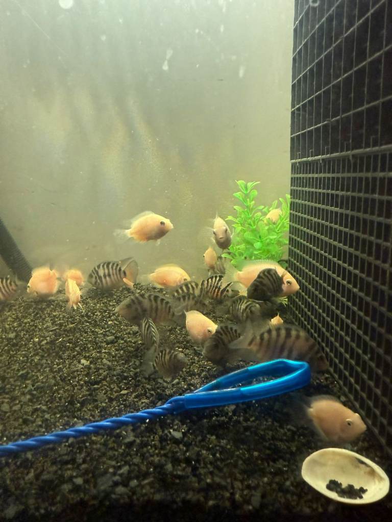 I currently have approximately 30 Convict Cichlids available for sale, including a selection of Albino varieties. These fish are healthy, well-maintained, and range in different sizes.
