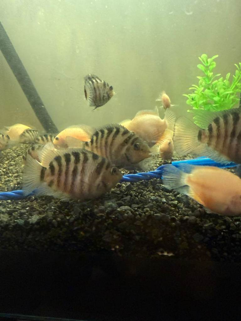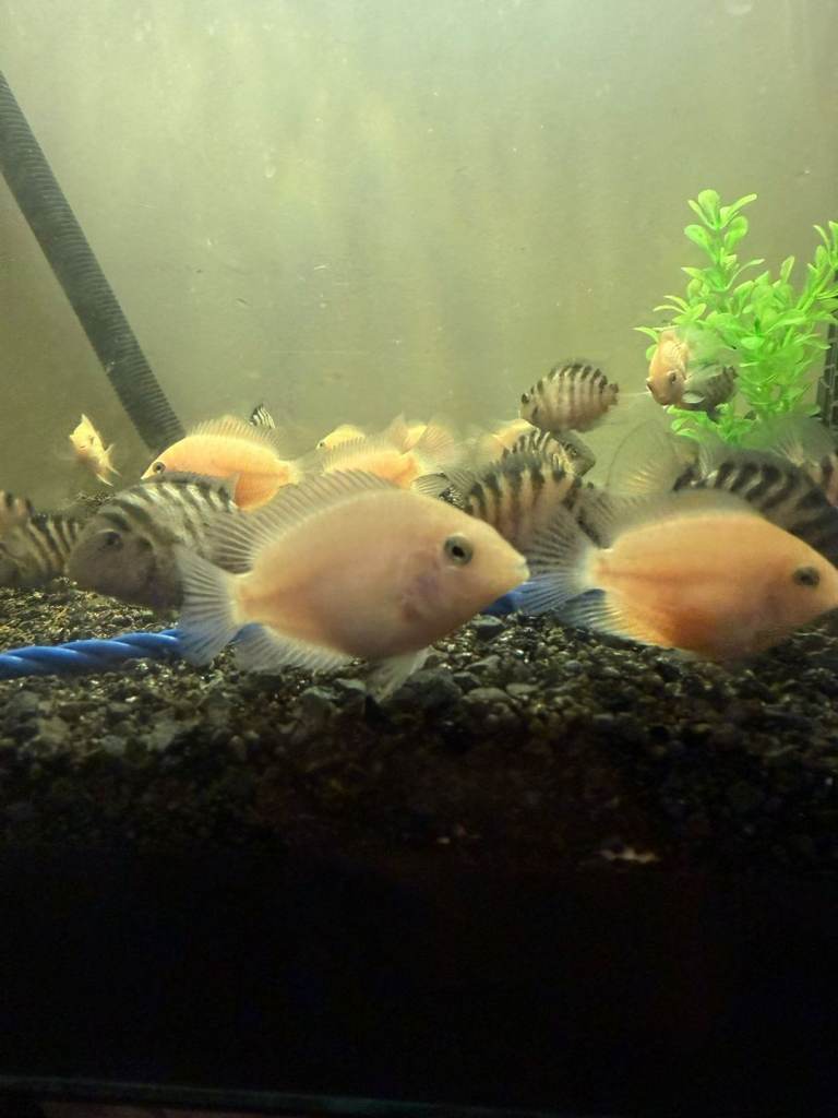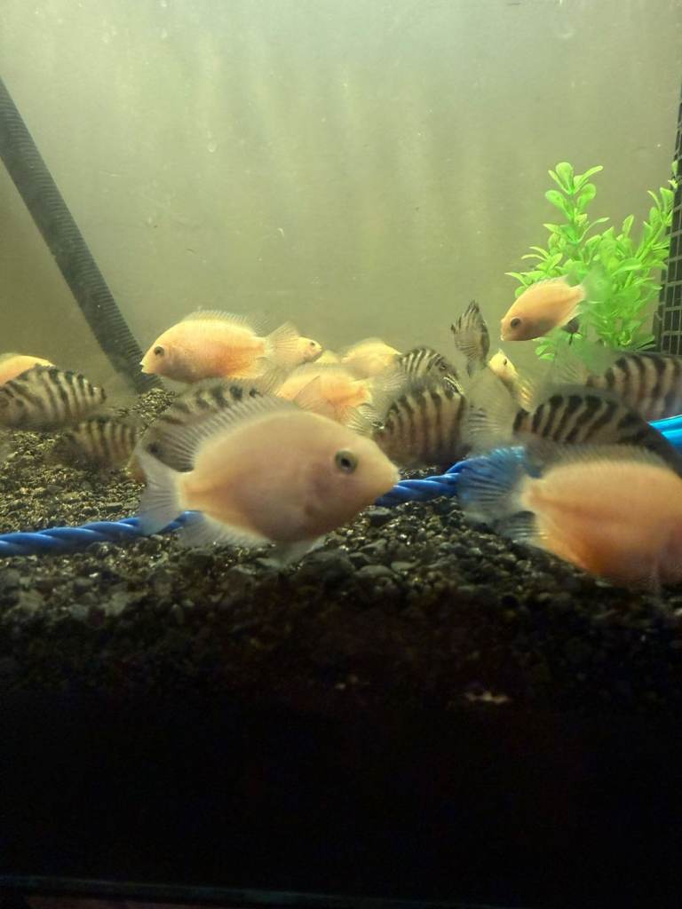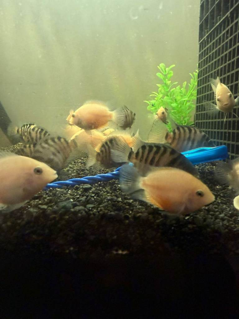 I currently have approximately 30 Convict Cichlids available for sale, including a selection of Albino varieties. These fish are healthy, well-maintained, and range in different sizes.