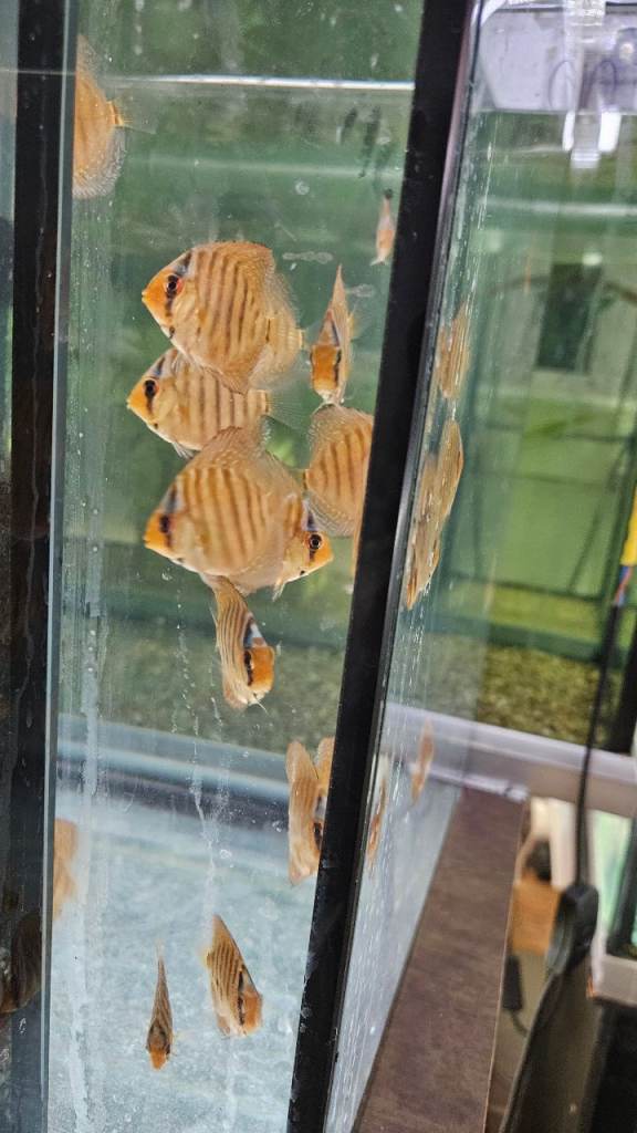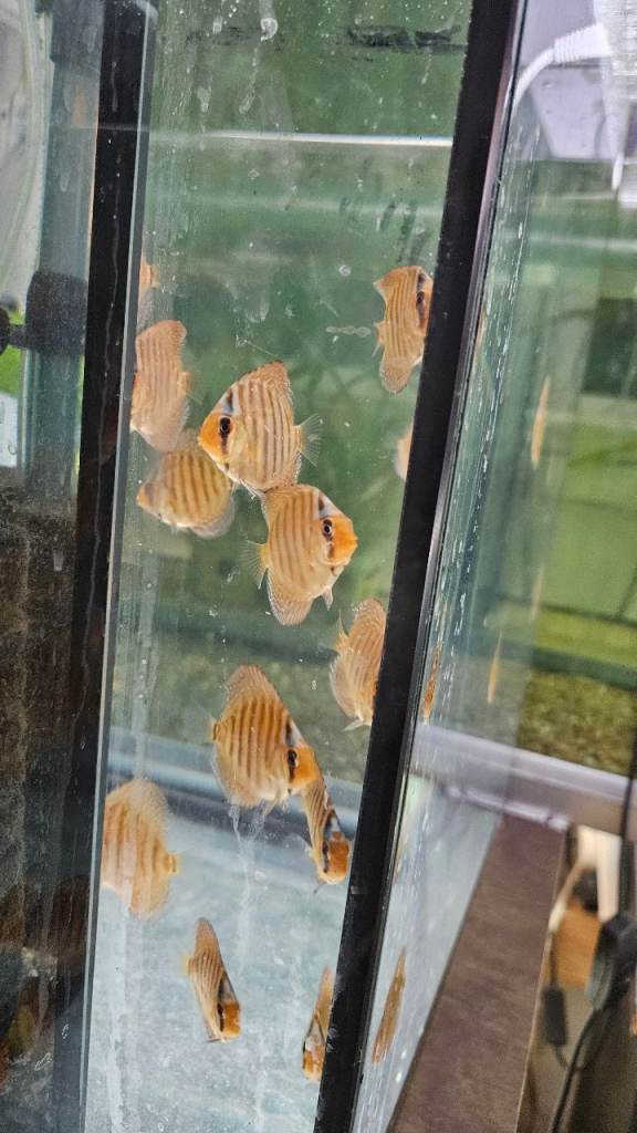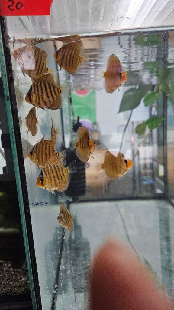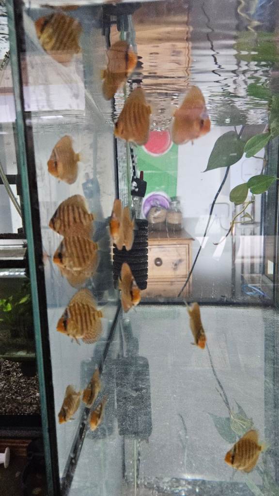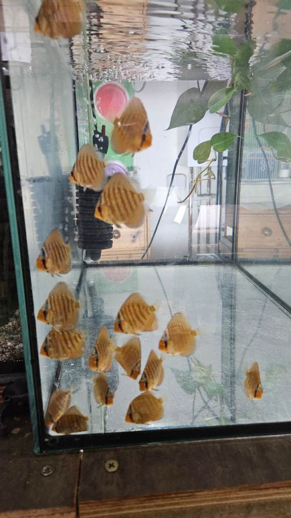 Discus Tiger Turquoise 2-2.5cm on the fins ,age 2 months, price £10 each.