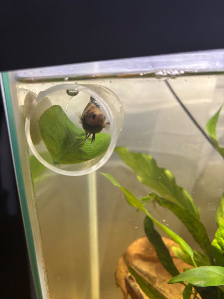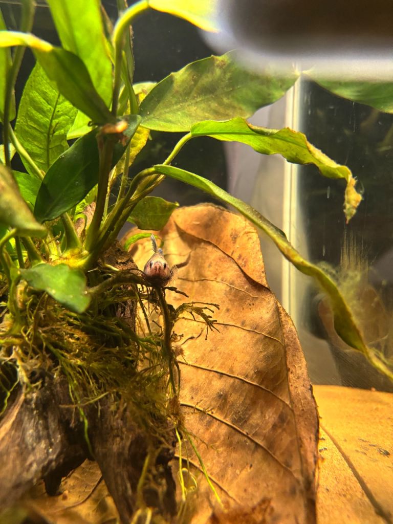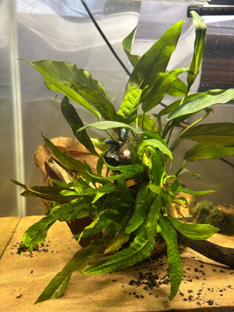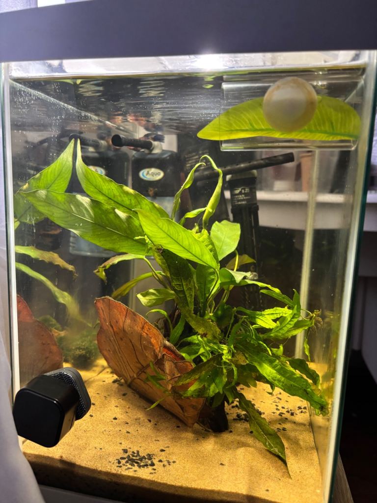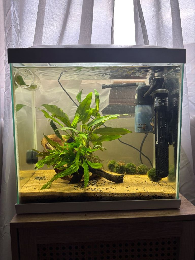 I’ve put drift wood with Anubias and Java fern glued to it, moss balls and almond leaves for the water to keep her healthy (hence the tinged hue of the water).