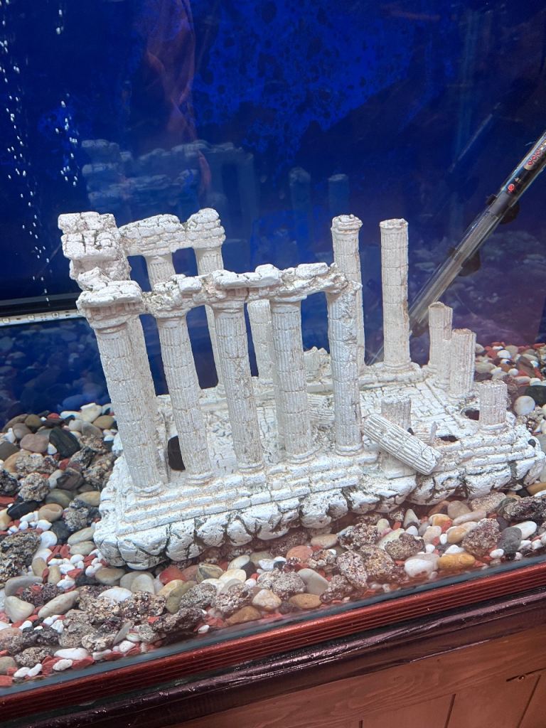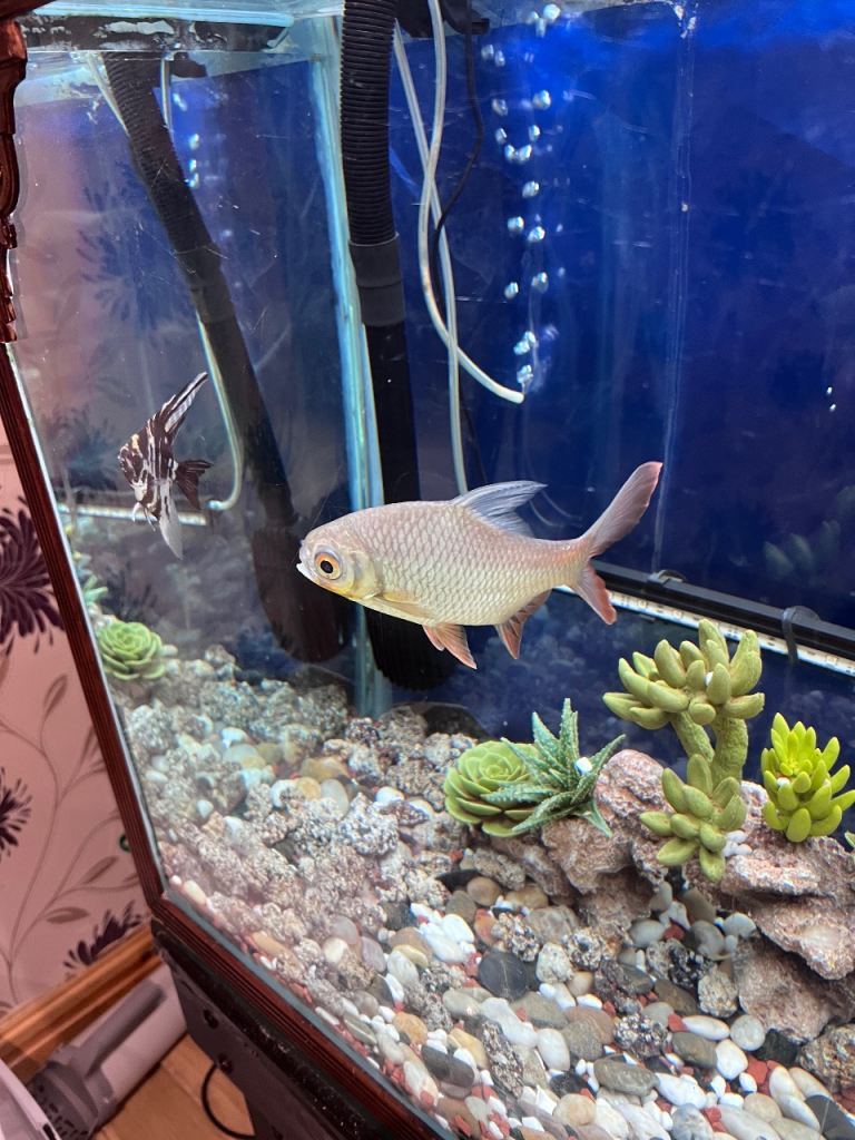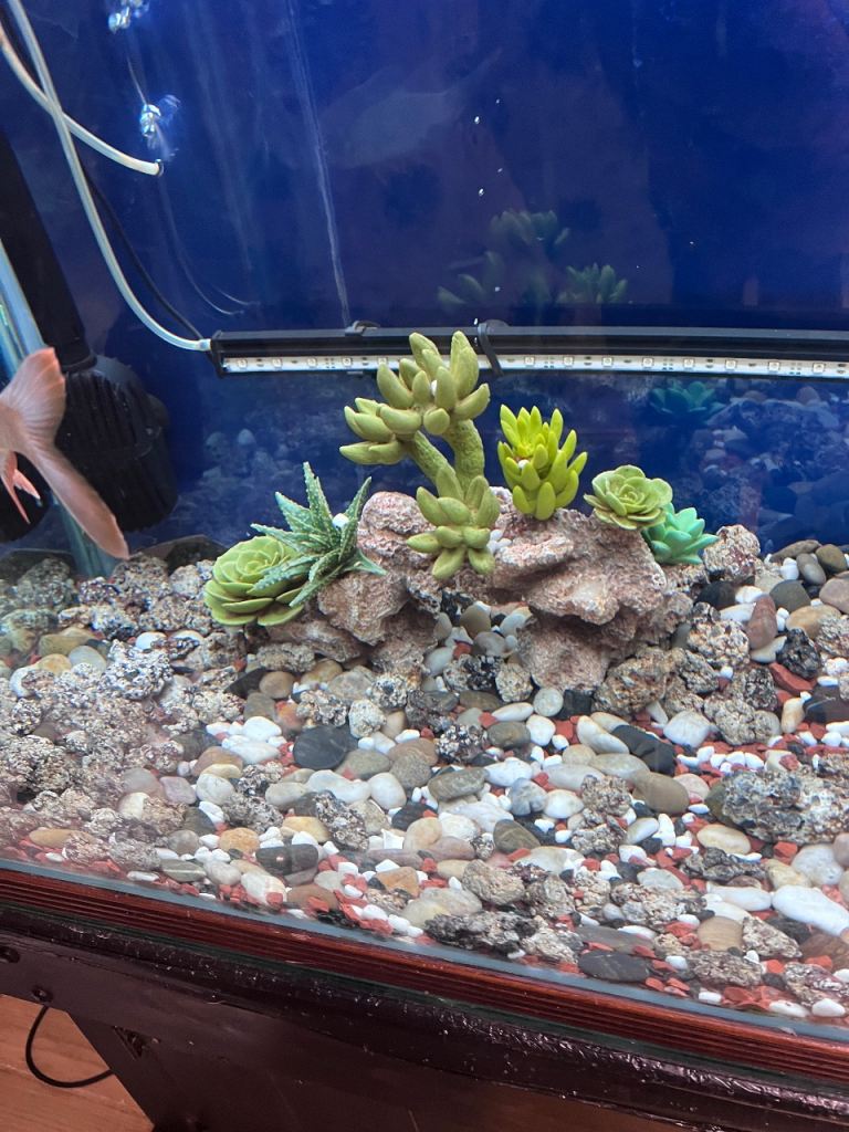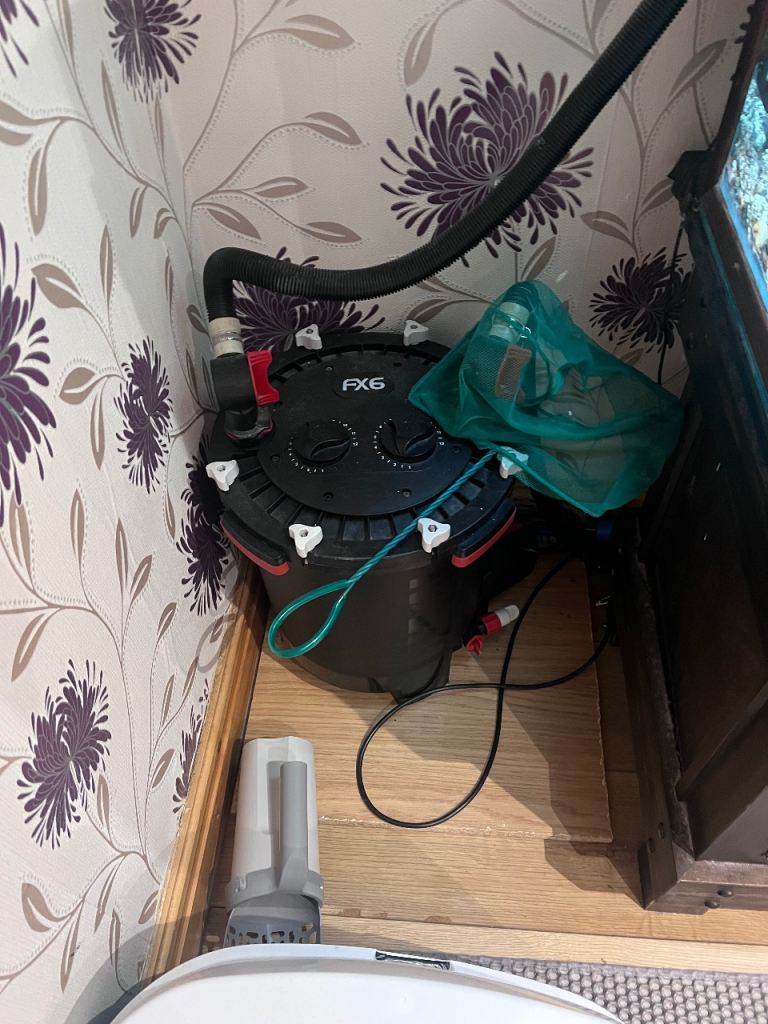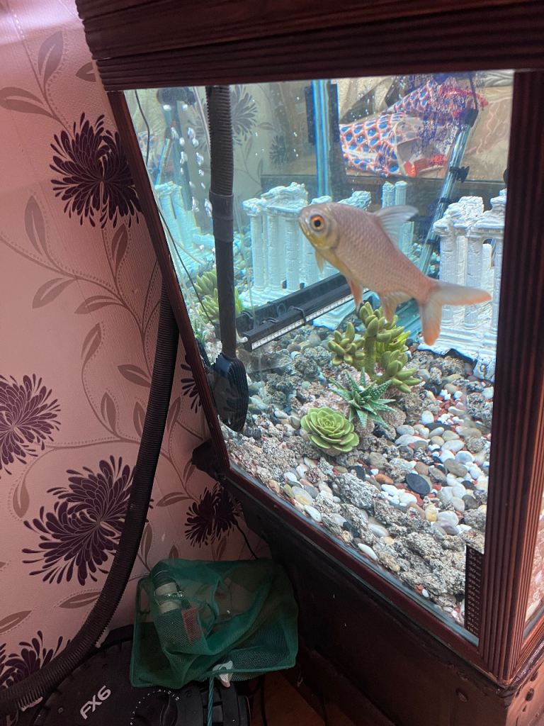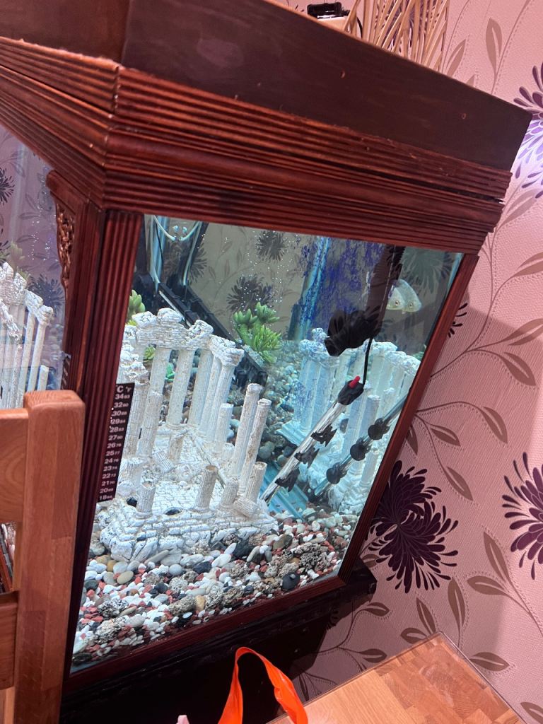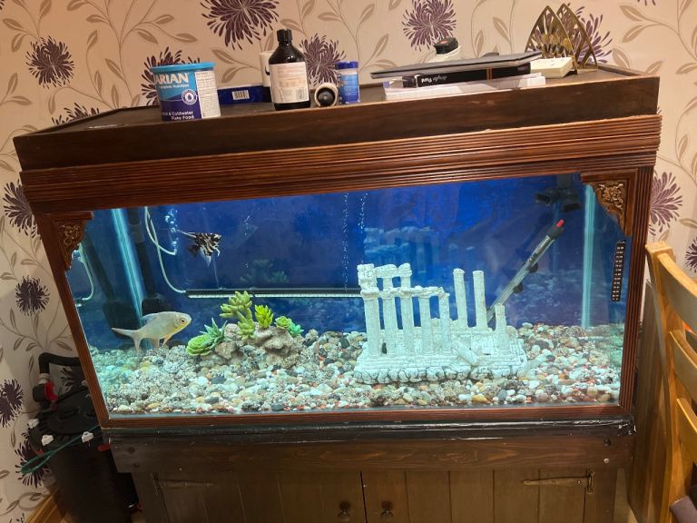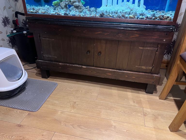 Large aquarium with wooden cabinet, owned for around 15 years. The tank is in good working condition for its age and has been well used over the years.