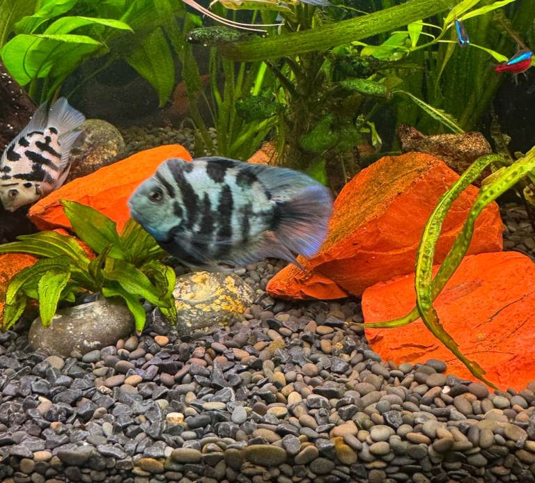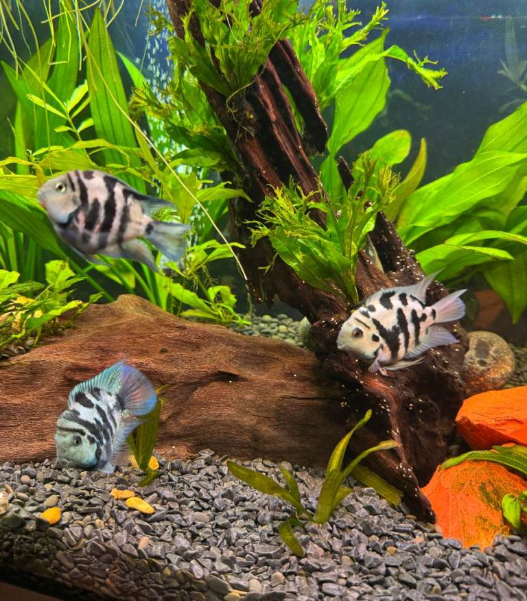 Five Beautiful Polar Blue Parrot Cichlids for sale. These are healthy, active, and very well-cared-for fish with striking blue coloration and bold stripes.