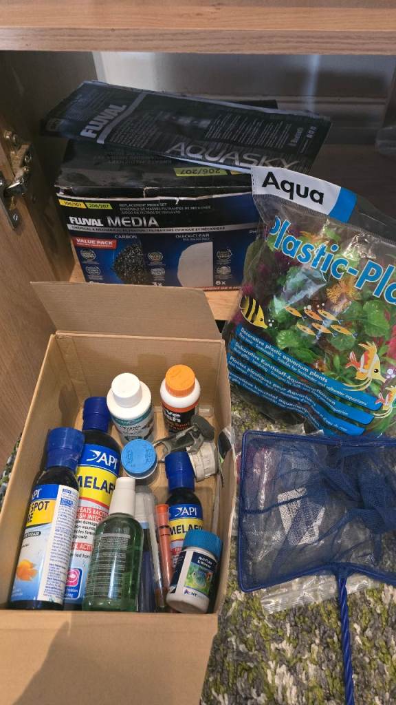 Complete setup. 4ft aquarium with cabinet external filter and internal filter. Fluval aquasky light. 16 malawi cichlids and 2 large catfish . Heater, food , air pump , rocks, sand , decor. Fish medicines , brand new media for filter new fake plants ,