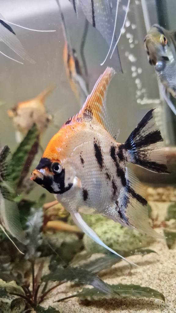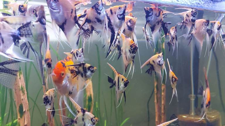 One of the most popular aquarium breeds, the Koi angelfish (Pterophyllum scalare) is an angelfish originating from the Amazon of Peru and Ecuador. Similar to all angelfish, the Koi angel is a peaceful fish with a beautiful appearance and a life span of up to 10-15 years. The Koi angelfish stands out due to its mottled black, white, yellow, and orange coloring. They have a slender body, reaching approximately 15-20 centimetres in length.