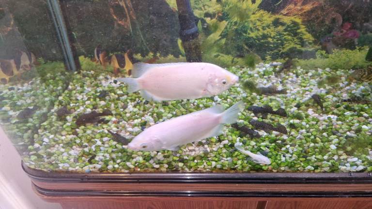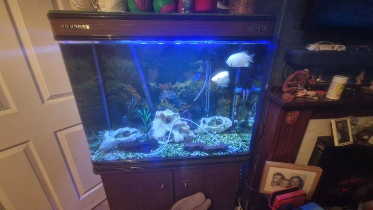 Boyu fish tank and stand comes with all.in the pics and fish large external filter decent lights on timer and heater full setup need gone asap tank is 32 wide 27 deep 16 front to back also 55 high With stand all in inchs £60 inbox for info 3x Raphael catfish to kissing gouramis about 10 bristlenose plecs need gone asap £60 for the lot