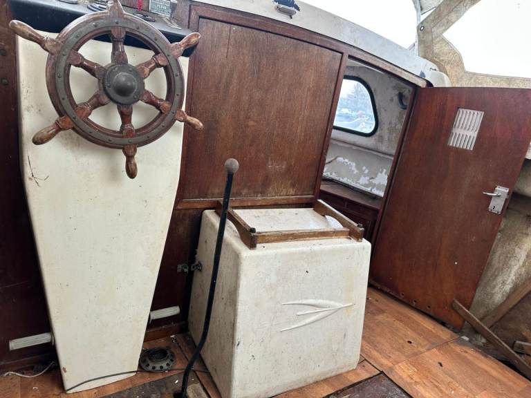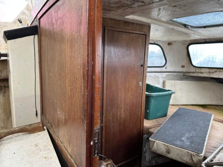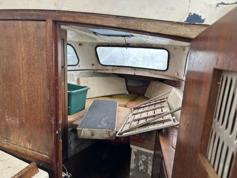 This rare Flevo cabin cruiser is believed to have been built in the 1960's. She's a good quality craft with many original fittings. The cabin has a vee berth, small heads and galley. The woodwork in the cabin is in good condition. The cockpit has a console for the wheel and controls. The plywood panels lining the cockpit are not fixed and some are in poor condition but would serve as templates for new panels. The hull is intact and appears in good condition. The hull and superstructure have been painted (poorly) and this is flaking off. The canopy is complete but has some tears. The length is 19ft, the beam is 8ft.