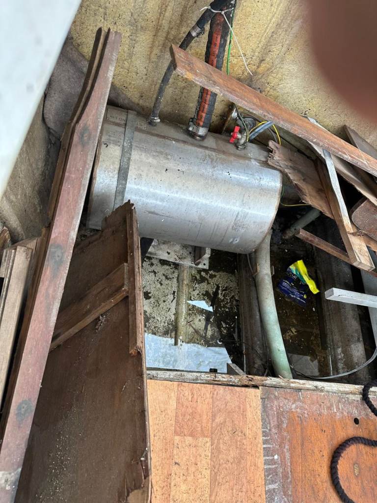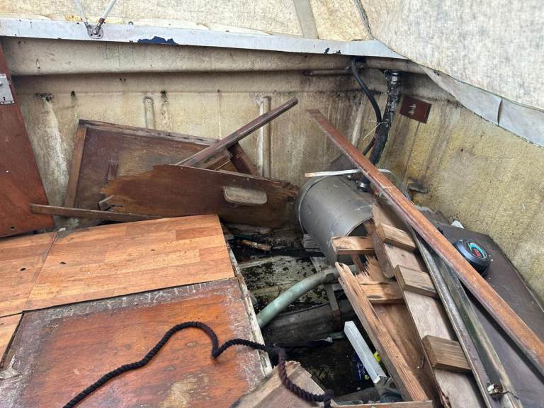 The inboard engine is a Ford 4 cylinder petrol which starts and runs but needs a little work with the fuel as runs with a bottle at the moment and the gearbox is working. The builders, Flevo, are still trading in the Netherlands and building much larger vessels.