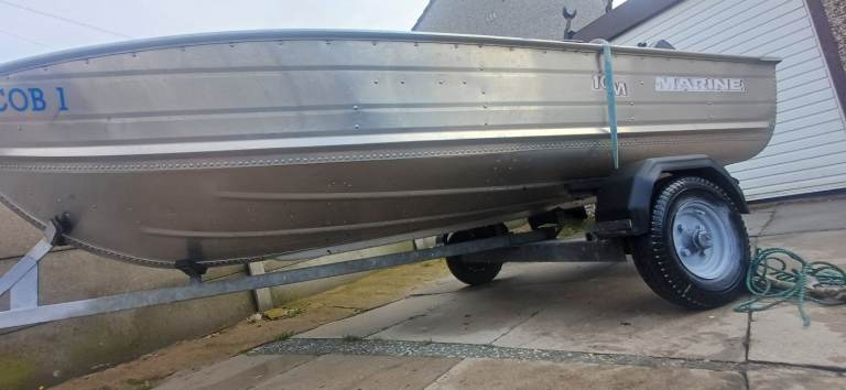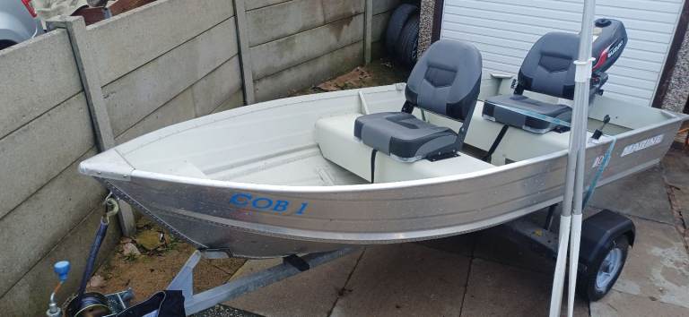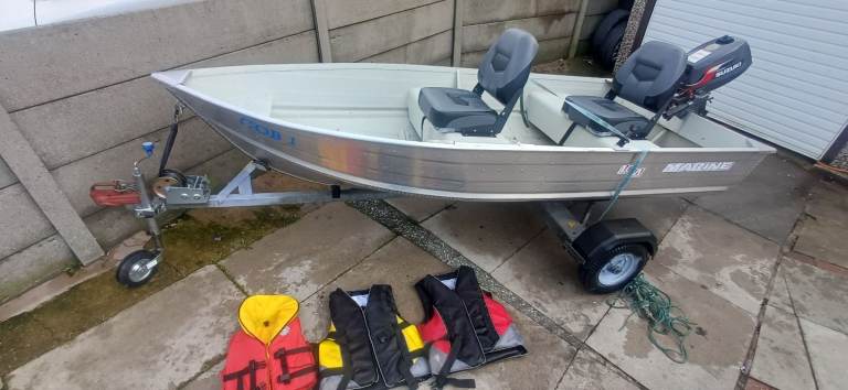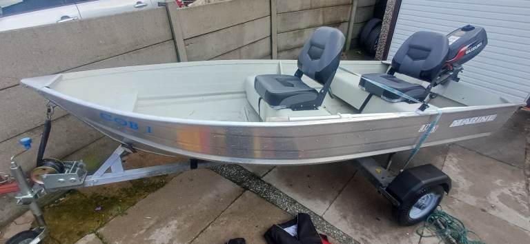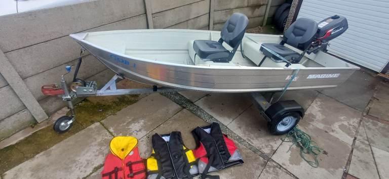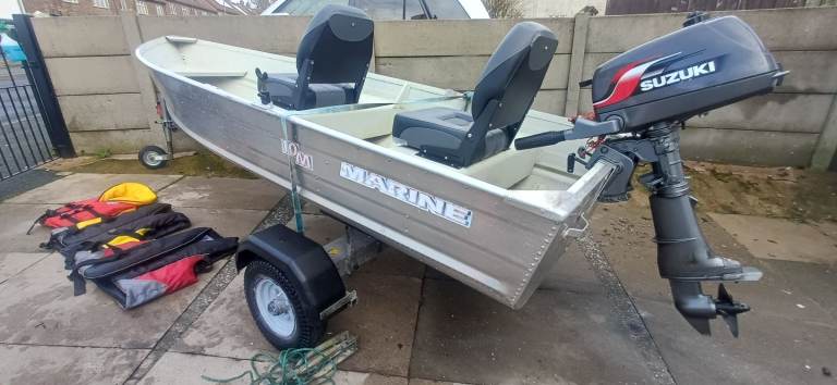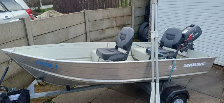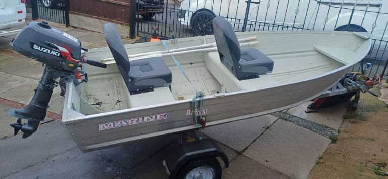 Marine 12ft aluminium fishing boat excellent condition sitting on a excellent bunk trailer with a 4hp suzuki 4 stroke outboard all in excellent condition ideal pike season boat handles lovley, brilliant for plodding around the lake district comes with a set of oars 2x adult life jackets and 1 child's anchor and 2 fixed comfortable seats