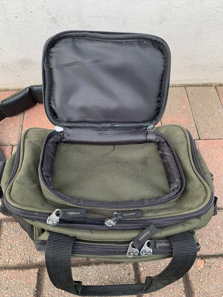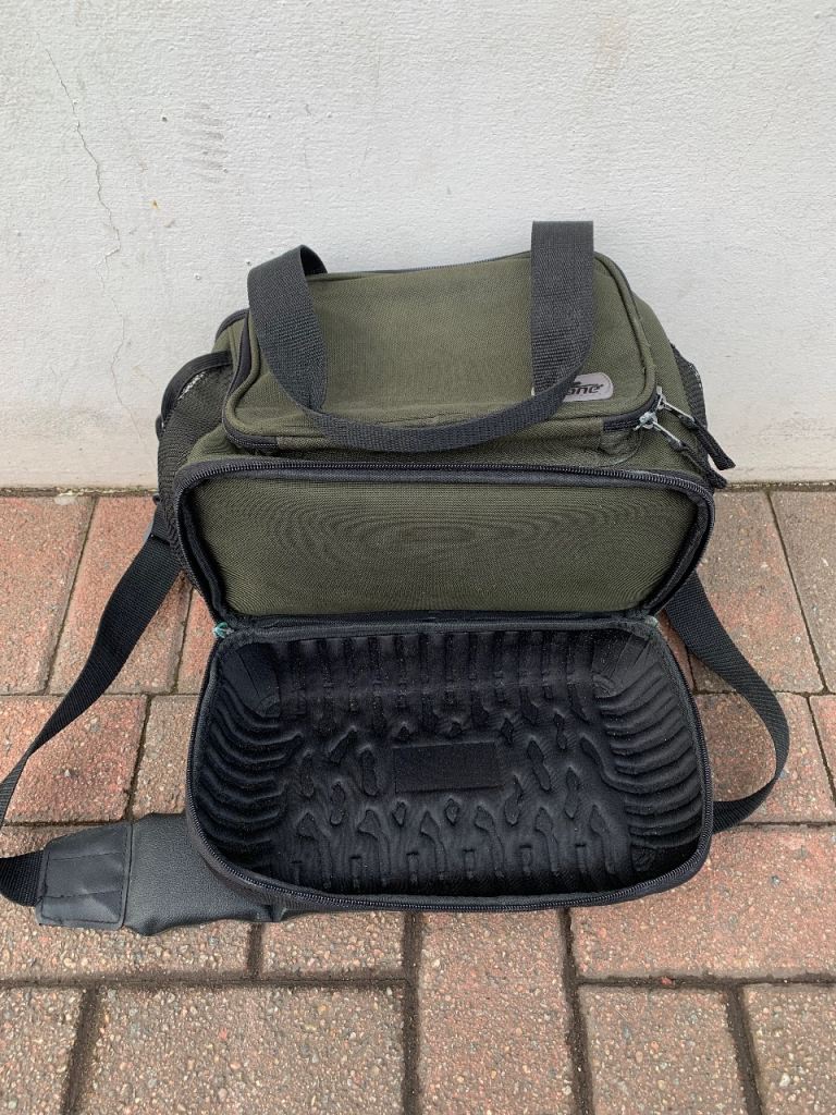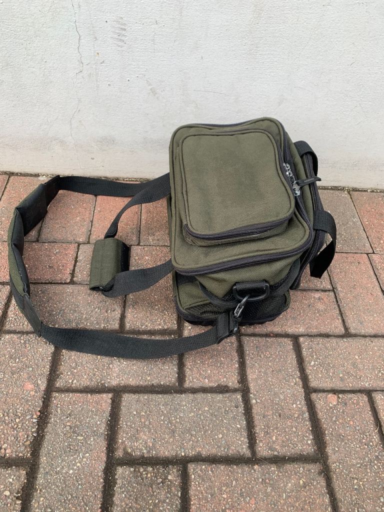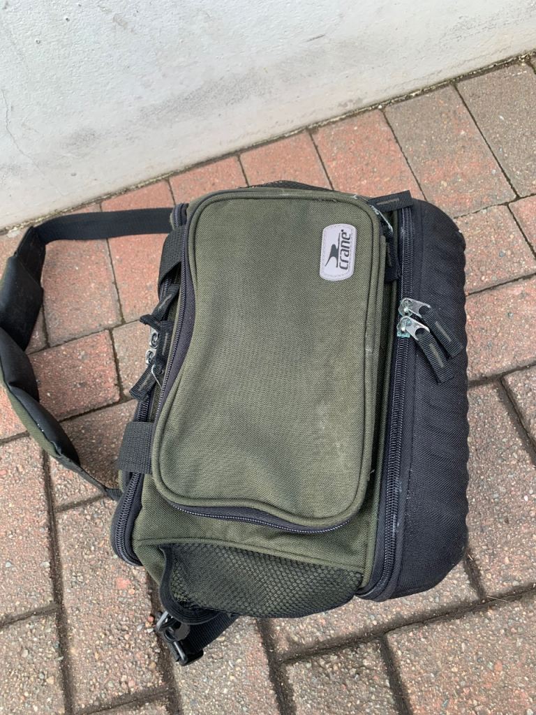 Crane fishing tackle storage bag , loads of storage space with loads of compartments all zips work fine comes with shoulder strap and carry handles. 35 x 25 x 20 cms approx.