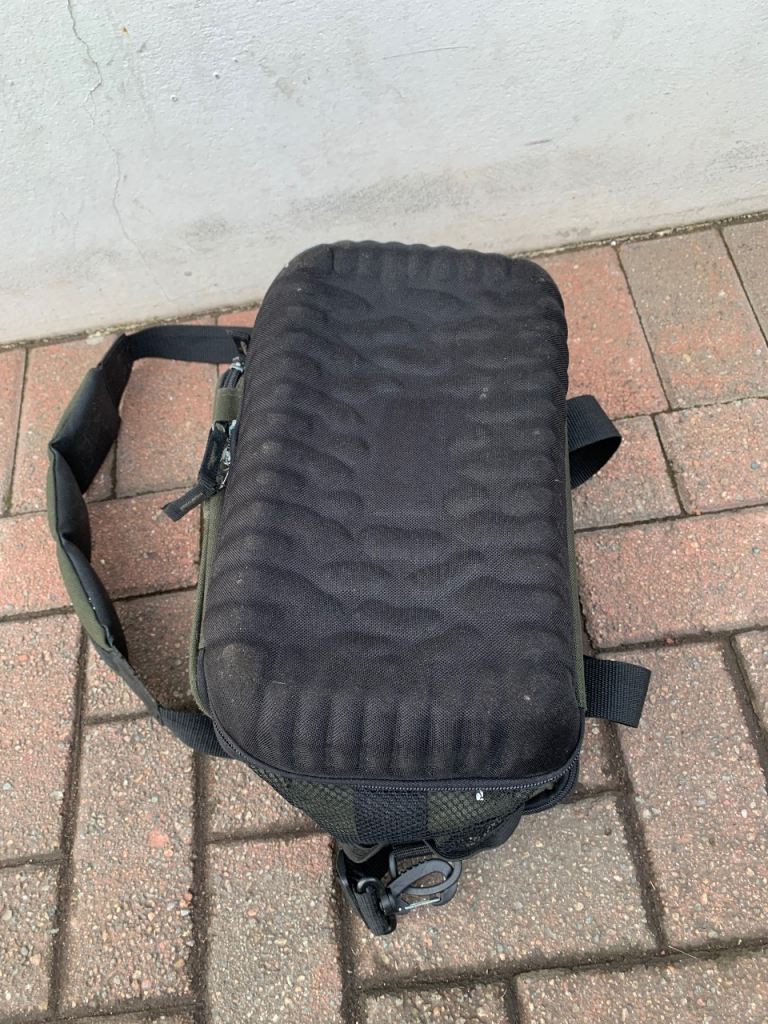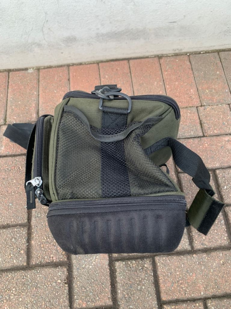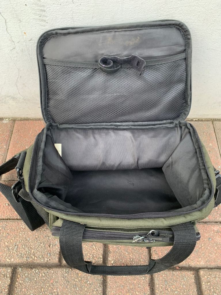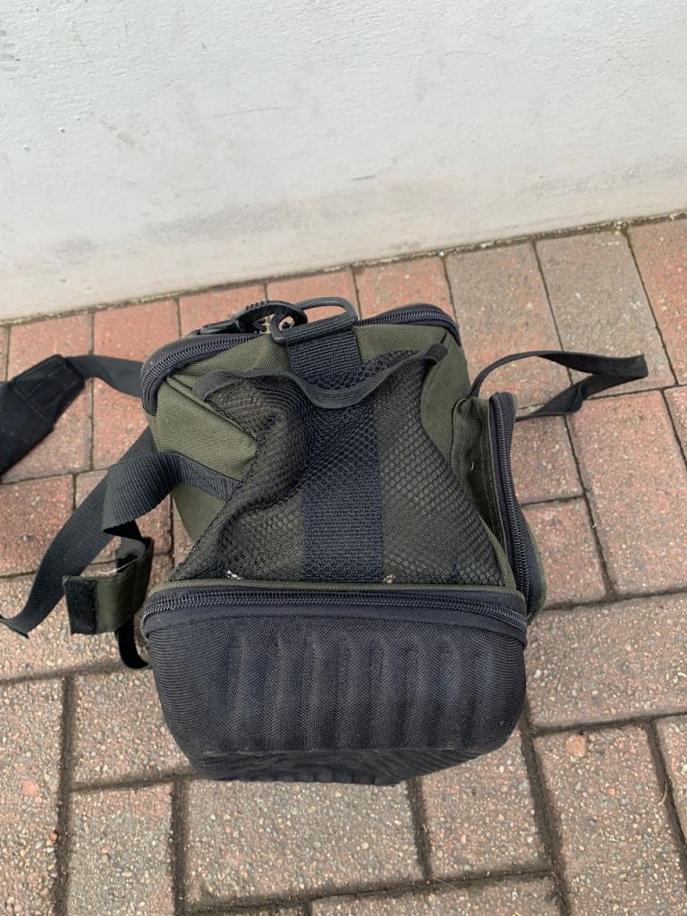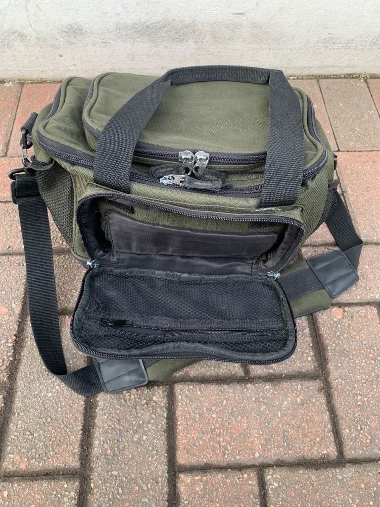 Crane fishing tackle storage bag , loads of storage space with loads of compartments all zips work fine comes with shoulder strap and carry handles. 35 x 25 x 20 cms approx.