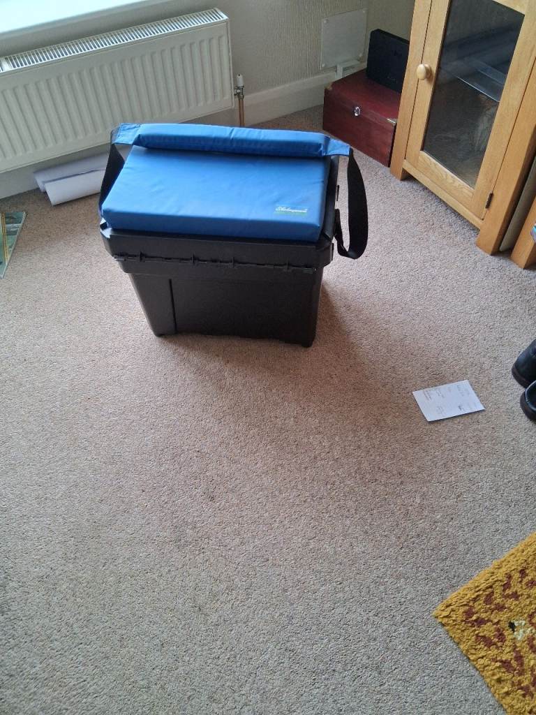 Large Shakespeare fishing box with padded seat and padded carrying strap.