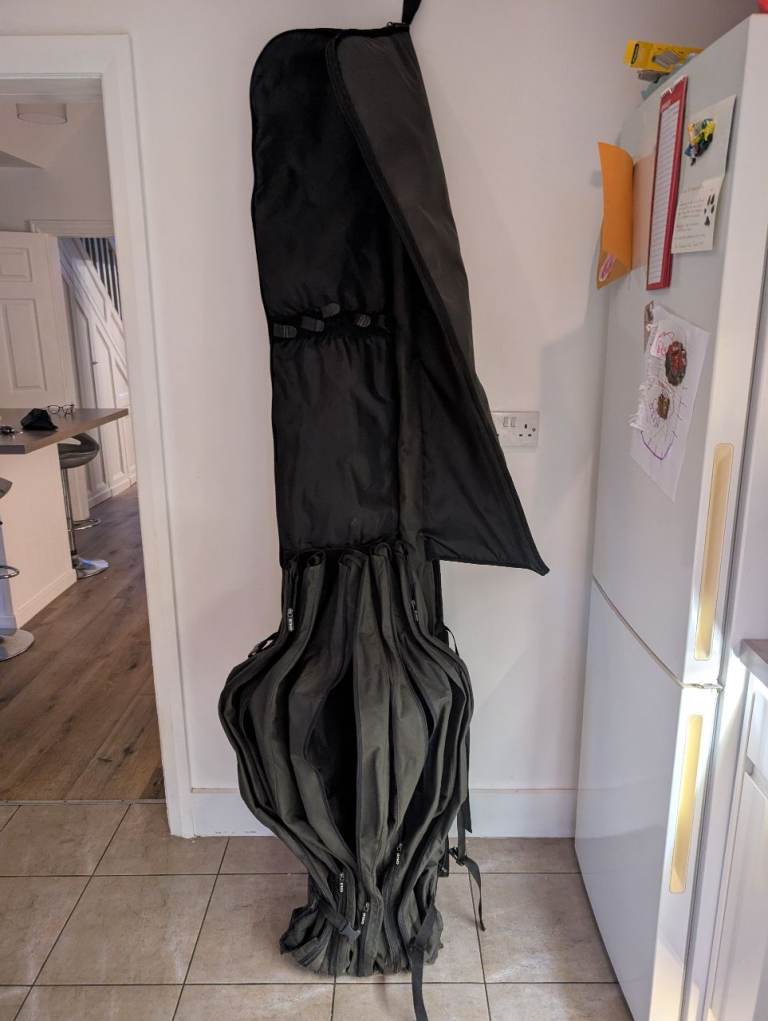 Holds 5 made up rods. Large pocket for brolly/day shelter and landing net handles. All zips and straps working