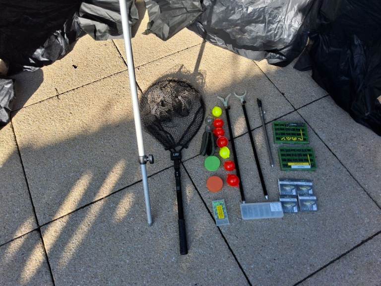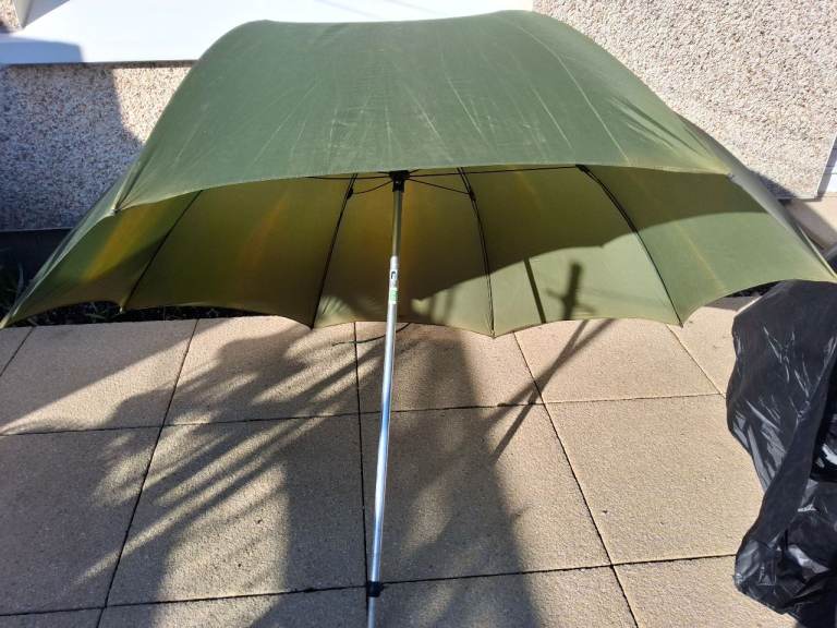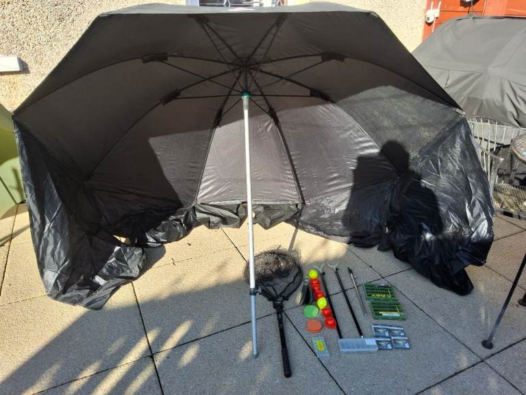2 Fishing umberellas. 1 a TF gear with bag The green has slight tear in it. Not with bag Fishing net Floats. Rods supports and hooks in magnetic boxs. The lot for 60 pounds Cash and collection only
