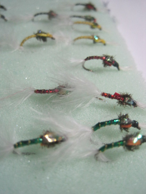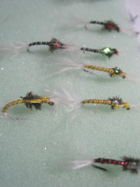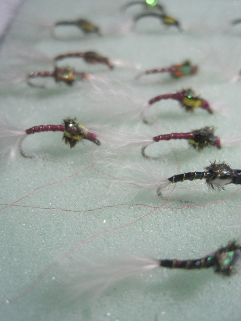 Buzzers dressed on a size 12 barbless hook. These feature shucks, breathers, ribbed body, peacock herl thorax, goose biots wing buds and mirage tinsel over the thorax.