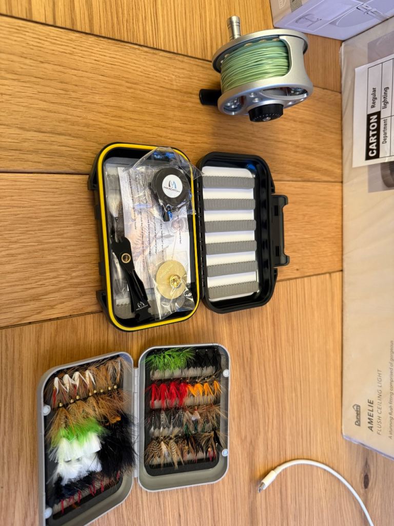Fly fishing set, 9ft rod, reel, hard carry case and flys. Bought last year but never used. I took lessons but never got hooked (pun intended).