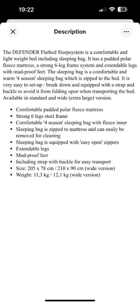 The DEFENDER Flatbed Sleepsystem is a comfortable and light weight bed including sleeping bag. It has a padded polar fleece mattress, a strong 6-leg frame system and extendable legs with mud-proof feet. The sleeping bag is a comfortable and warm '4 season' sleeping bag which is zipped to the bed. It is very easy to set-up / break down and equipped with a strap and buckle to avoid it from folding