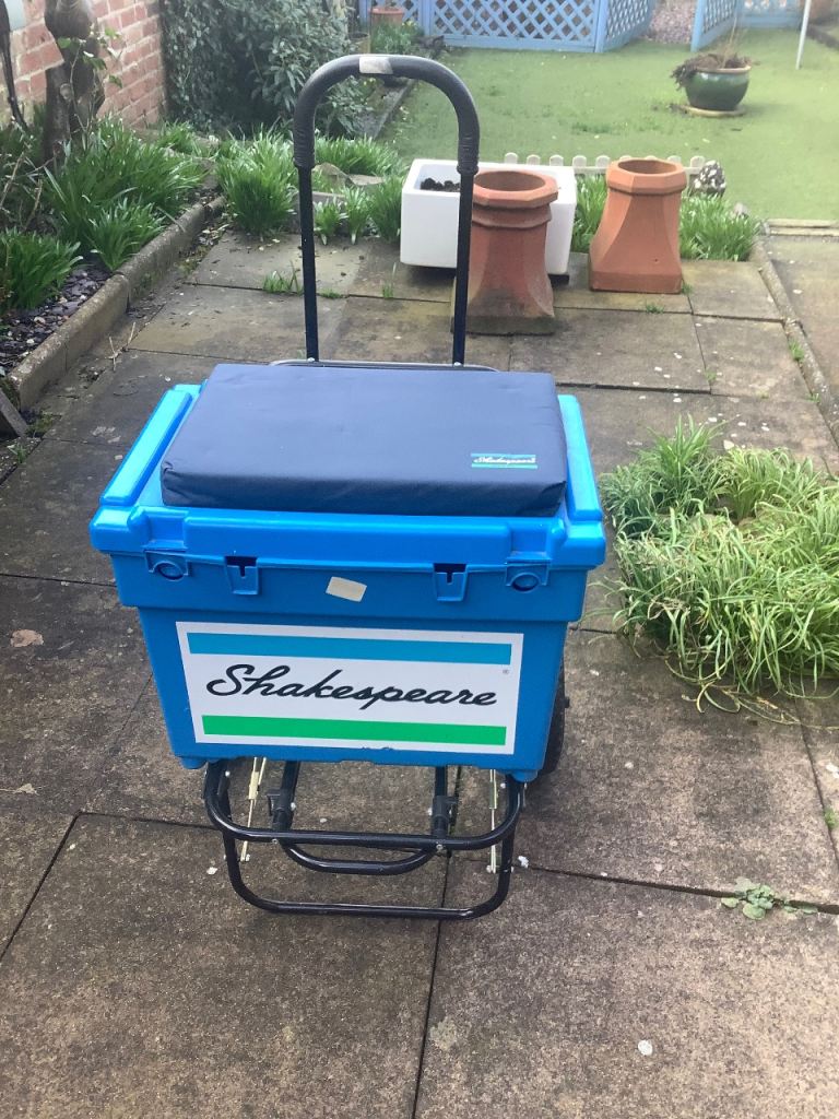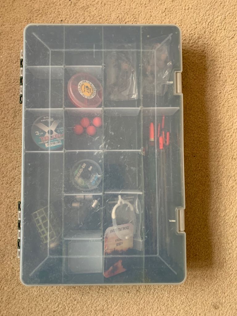 Fishing tackle box with adjustable compartments and some items of tackle that have been used.