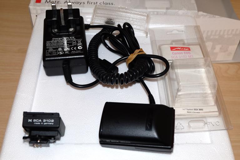 Metz 45 CL-4 Digital Flashgun. Complete with mounting bracket, charger (with multi worldwide socket connectors) and remote SCA adapters 3045 and SCA 3102 (suits Canon EOS digital, other adapters are available). Soft and wide angle diffusers included. In as new condition, very little use and in original packaging.