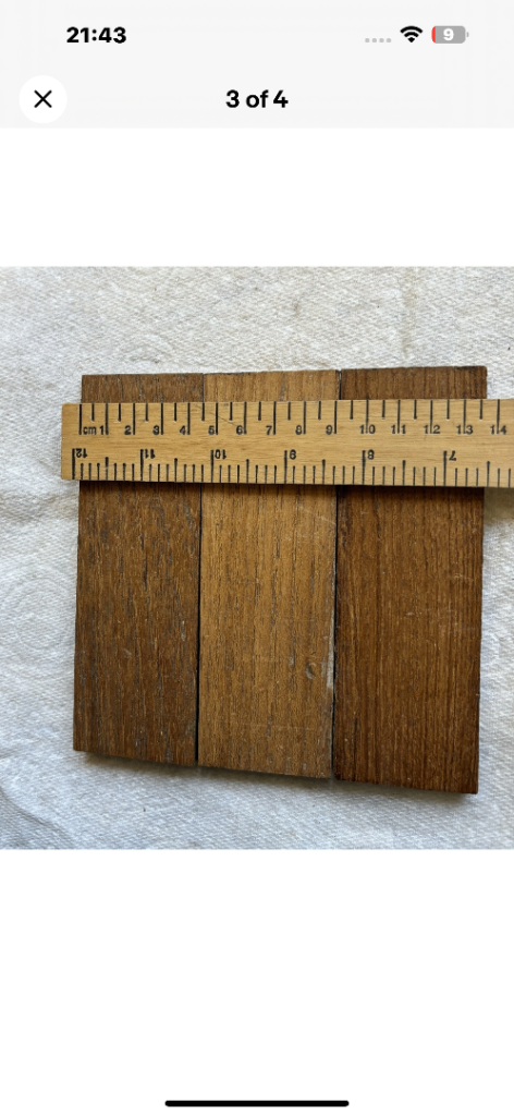 Estimated at least 50 years old if not more. Great condition but will need sanding and polishing. Taken up from bitumen glue so a thin layer remains on the underneath of each tile. Each finger is 140mm long and 46m wide. A square consists of three tiles approx 140mm sq . 147 fingers provides just under one square meter.
