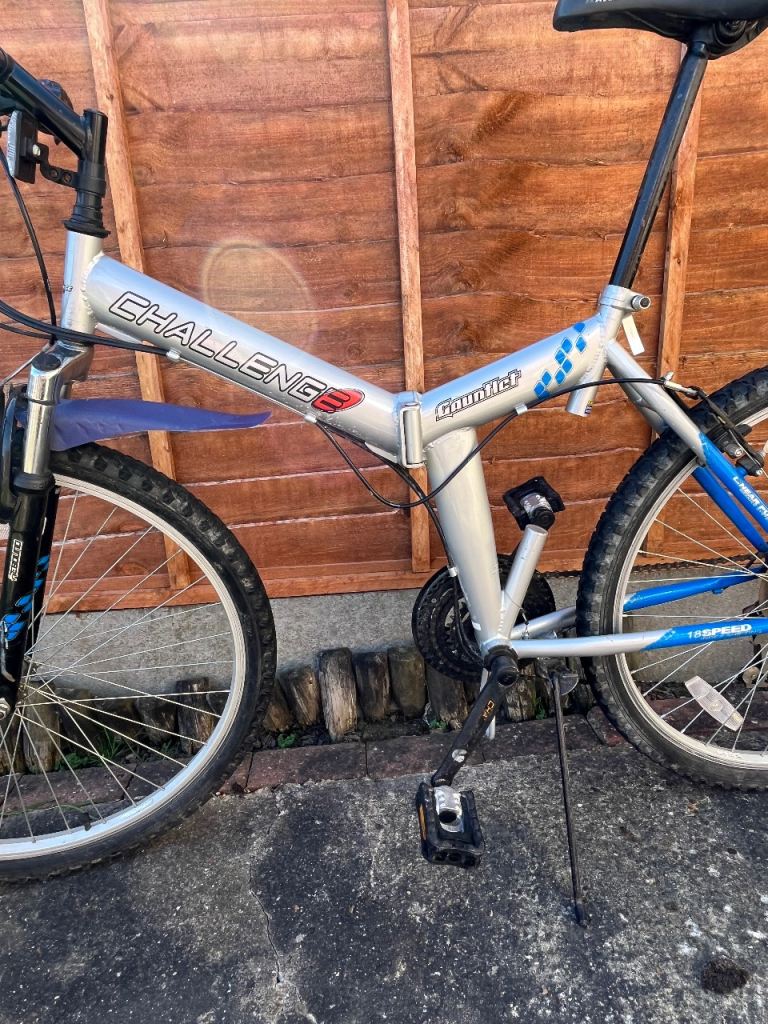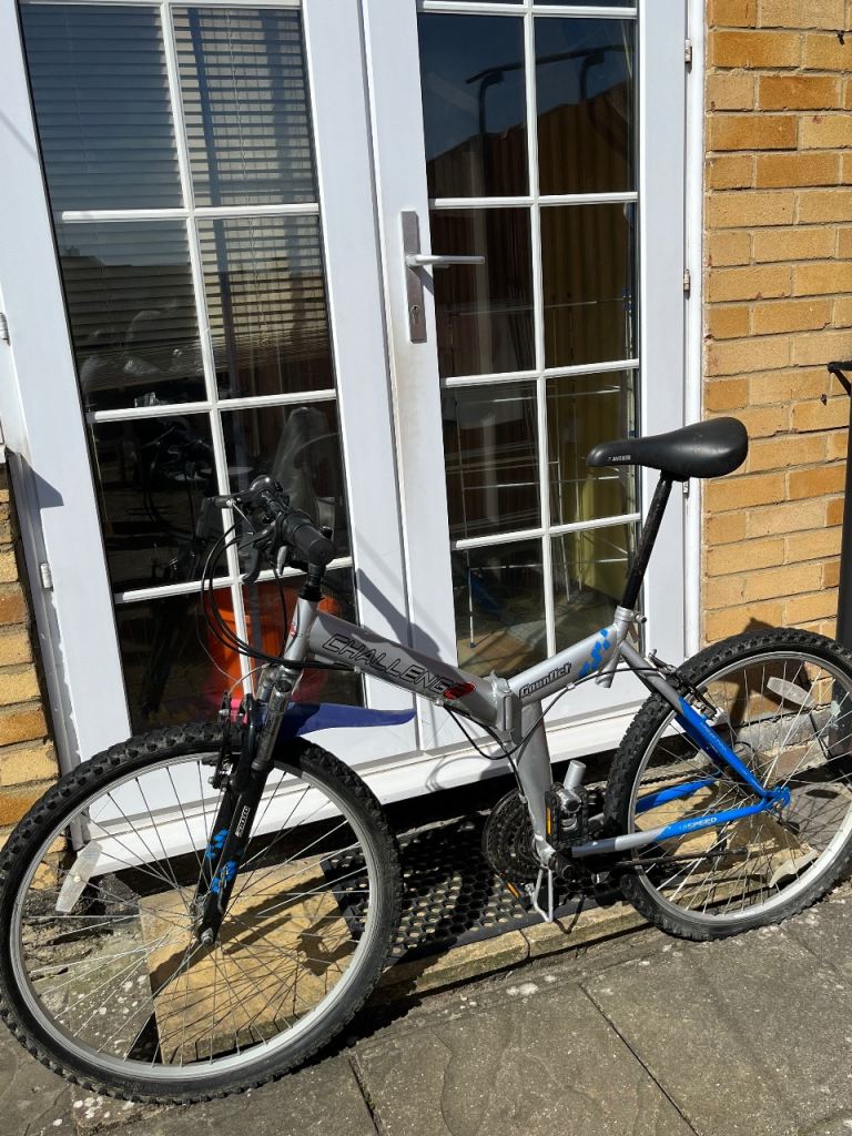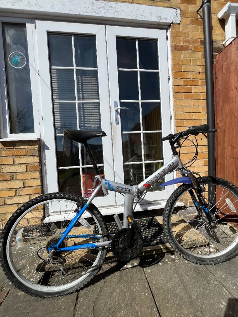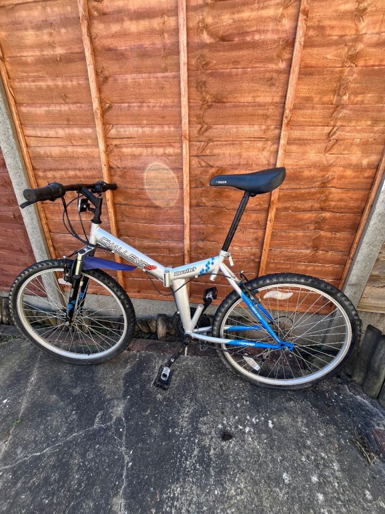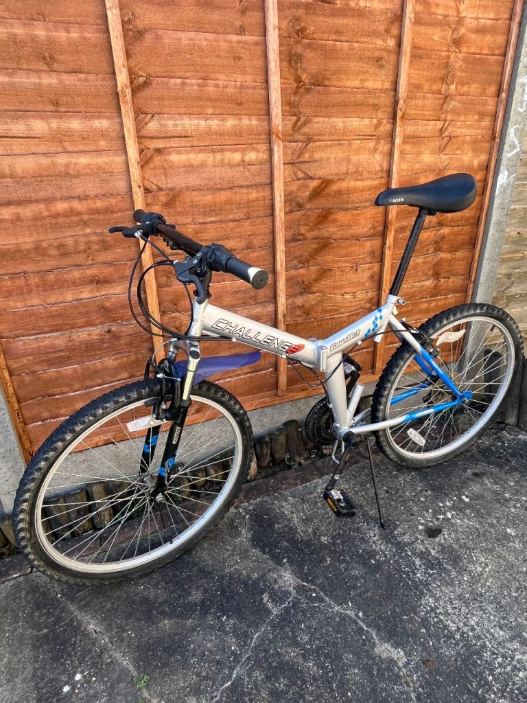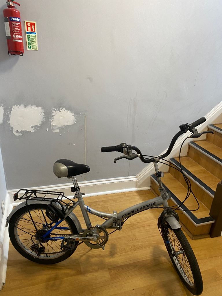 Folding Bike Challenge 18 gears speed Linear pull back breaking system , index shifter speed , has bike stand folding in pedals , reflectors , Bell , folds down flat for easy storage and putting in the back of a car on the train and bus . Used In good condition .