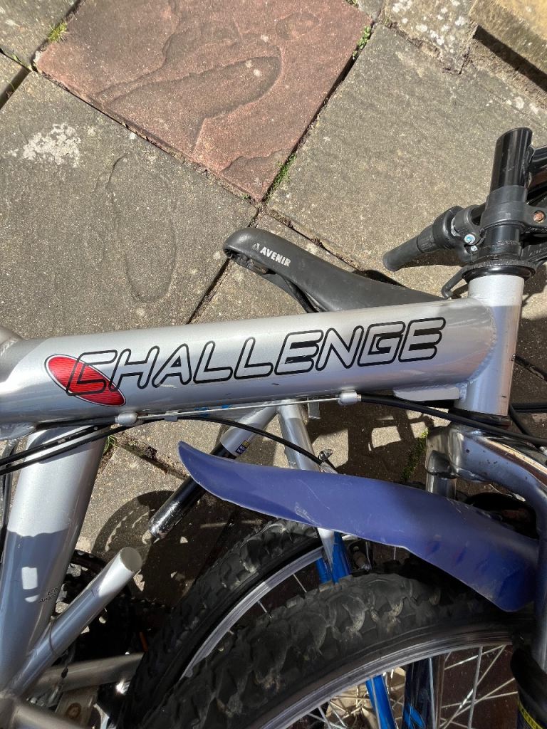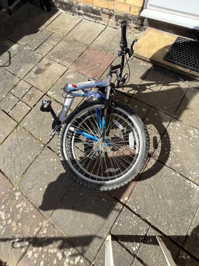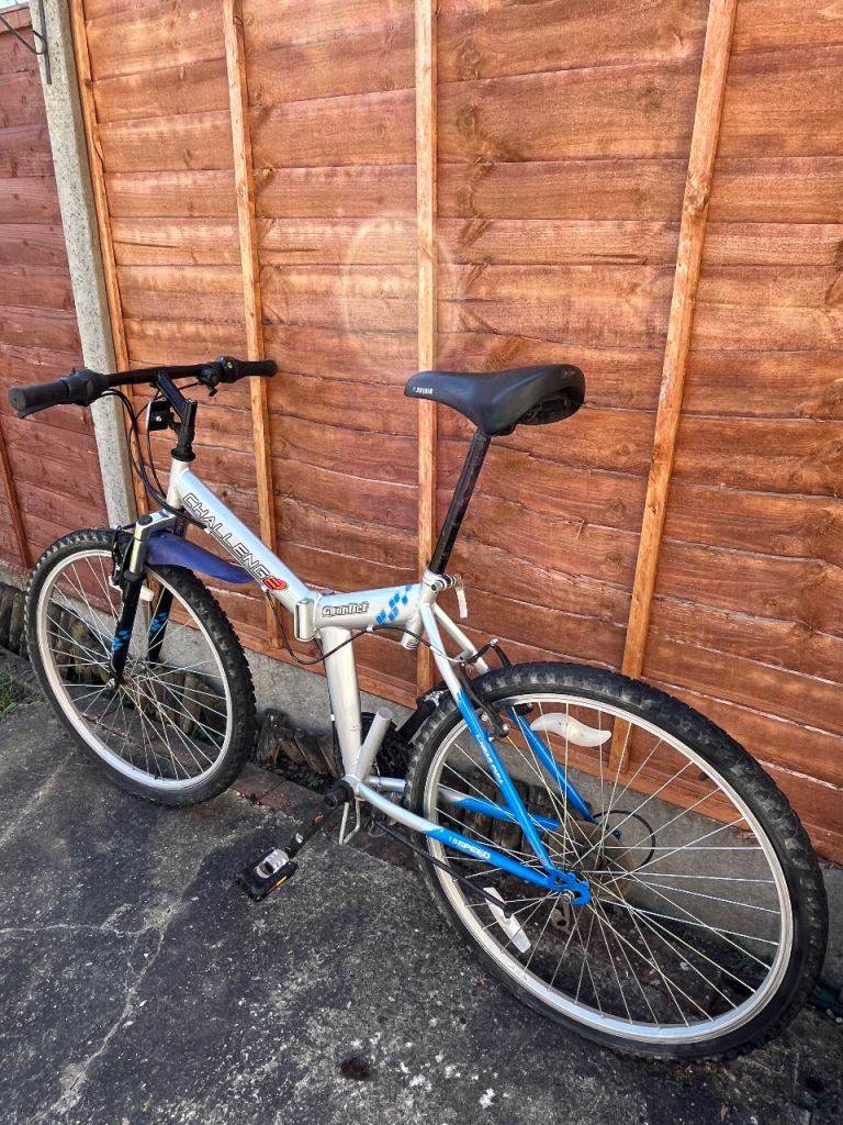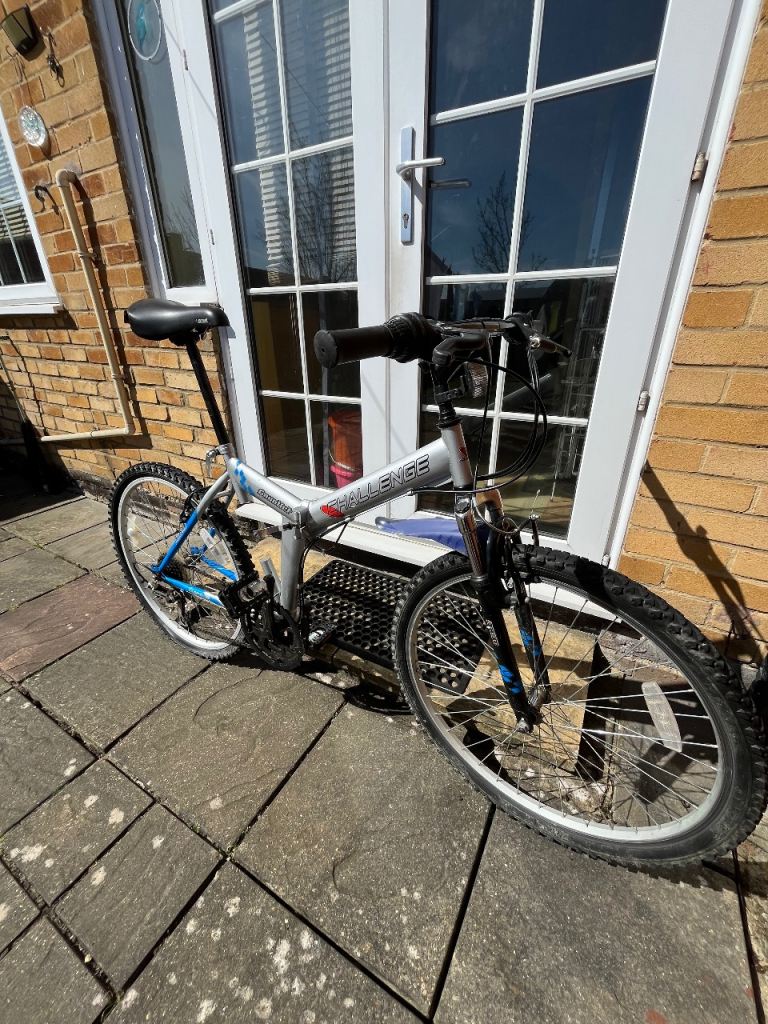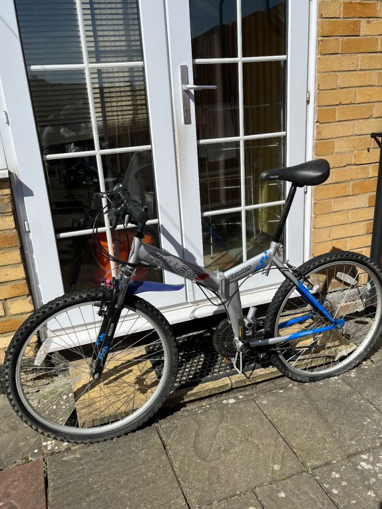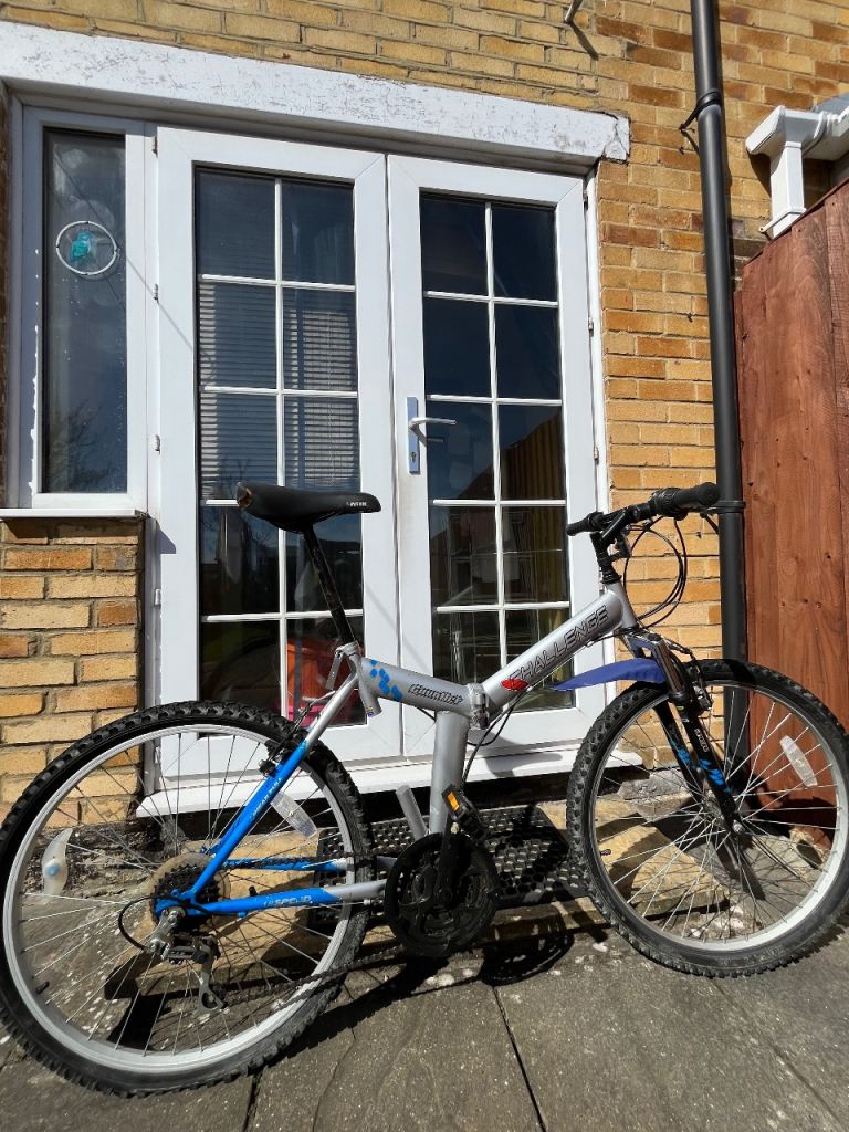 Folding Bike Challenge 18 gears speed Linear pull back breaking system , index shifter speed , has bike stand folding in pedals , reflectors , Bell , folds down flat for easy storage and putting in the back of a car on the train and bus . Used In good condition .
