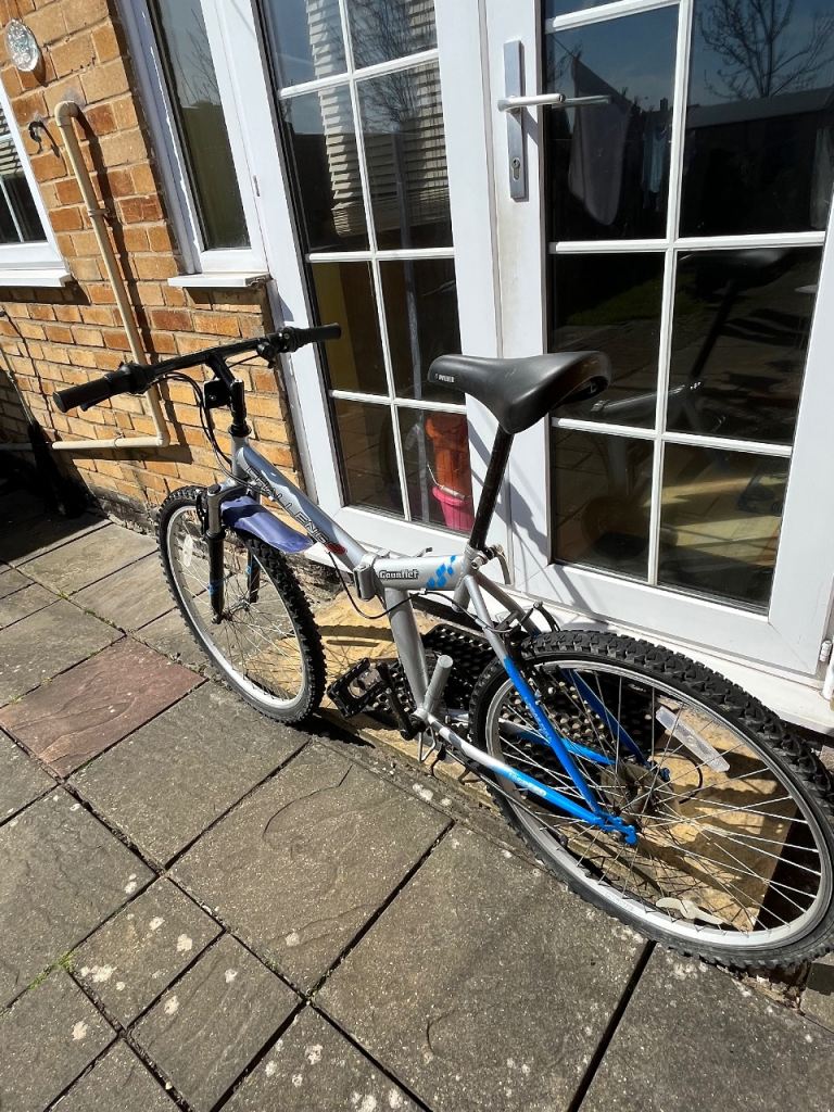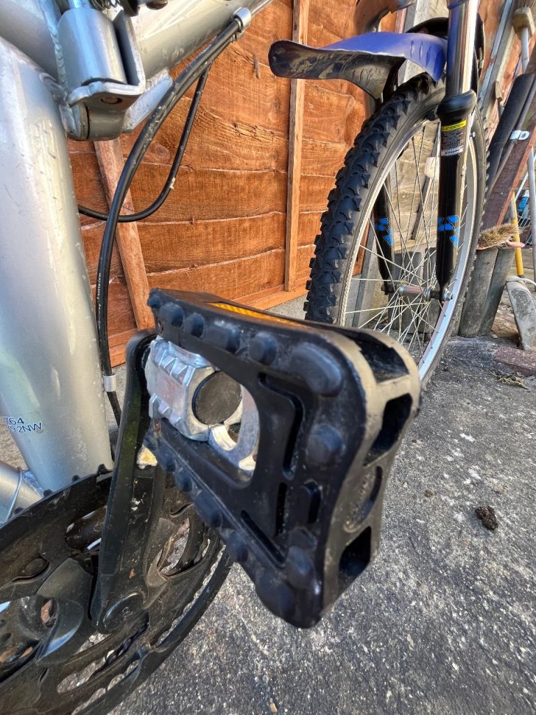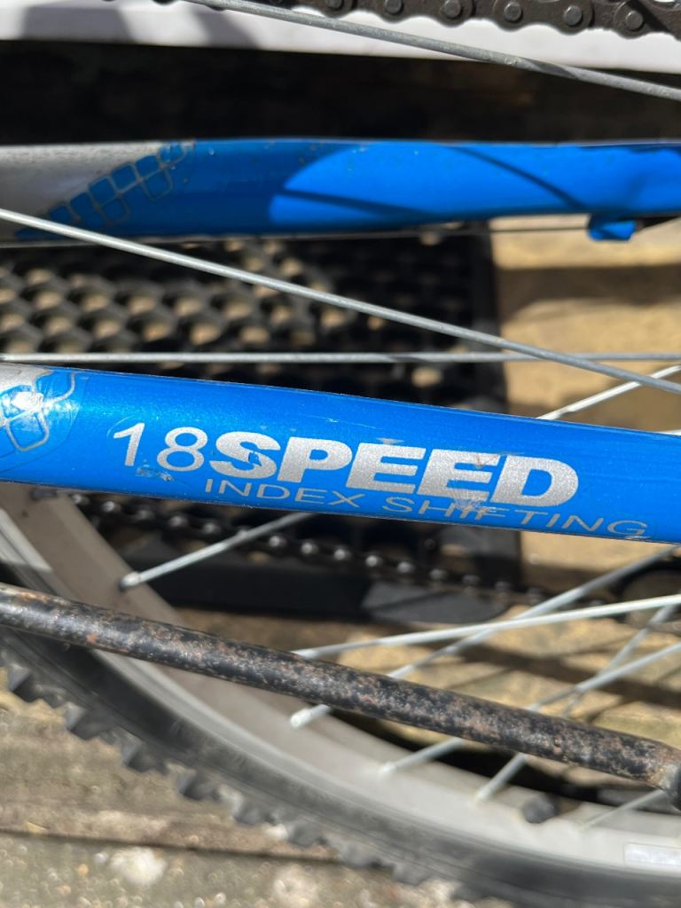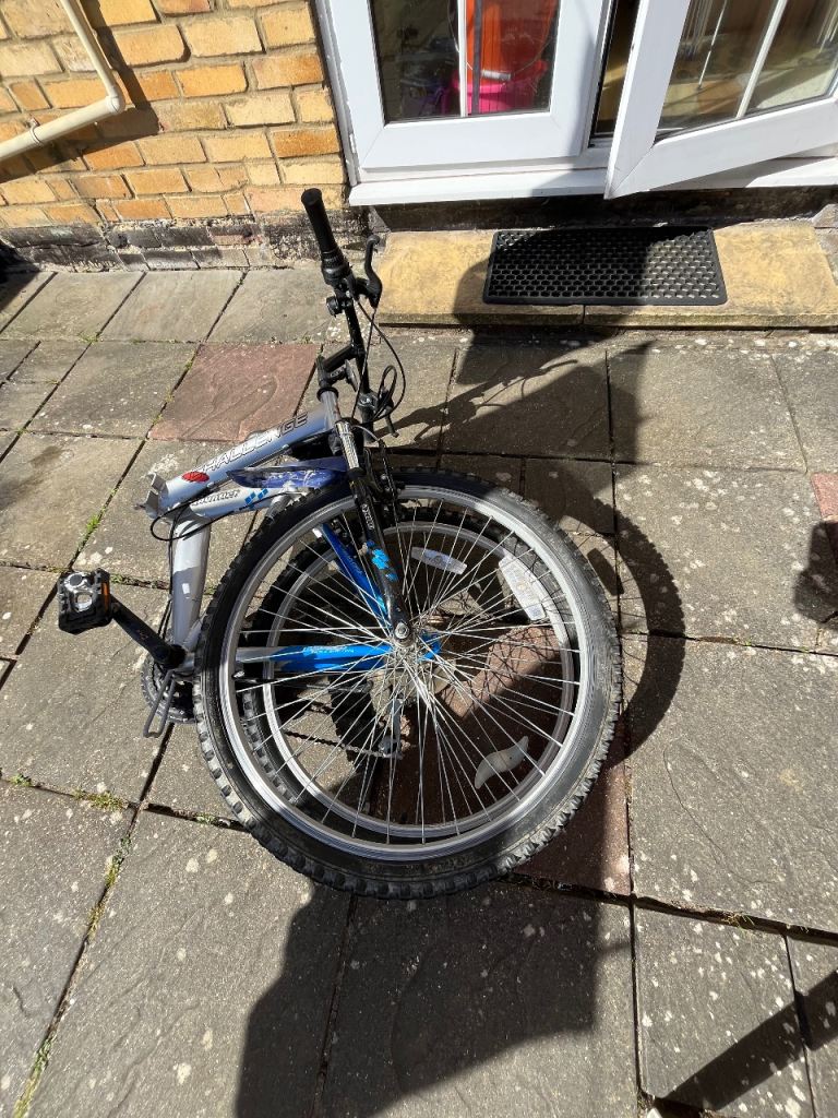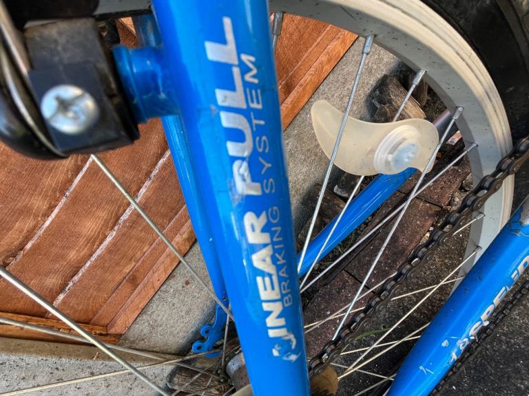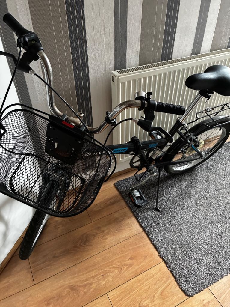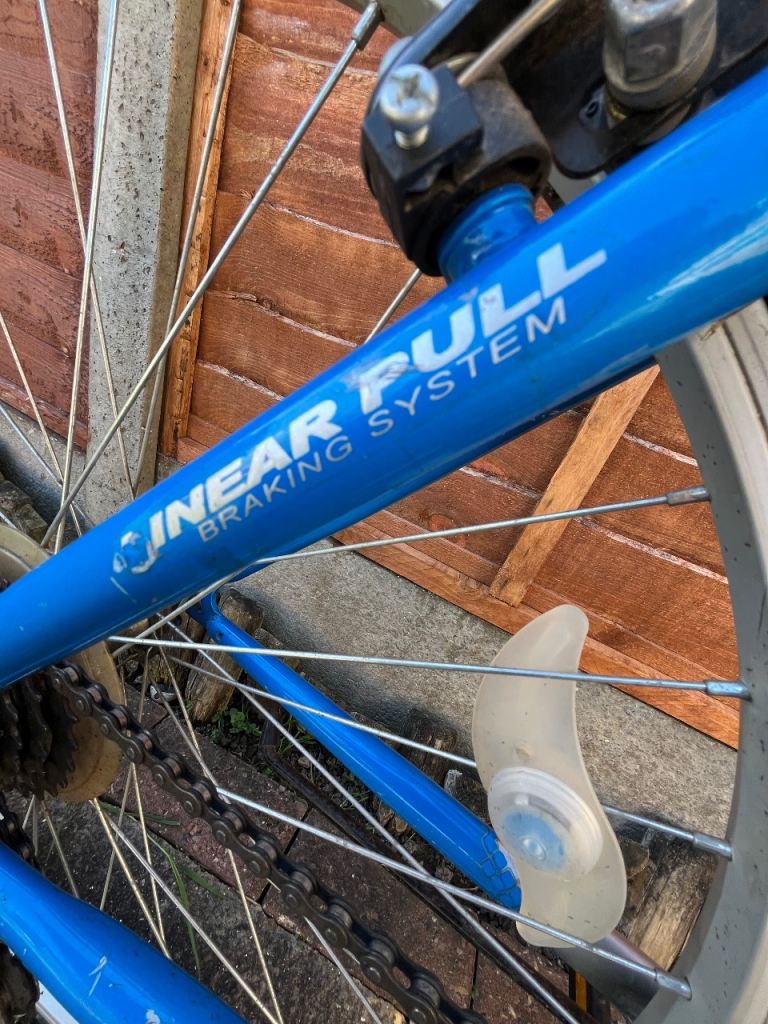 Folding Bike Challenge 18 gears speed Linear pull back breaking system , index shifter speed , has bike stand folding in pedals , reflectors , Bell , folds down flat for easy storage and putting in the back of a car on the train and bus . Used In good condition .