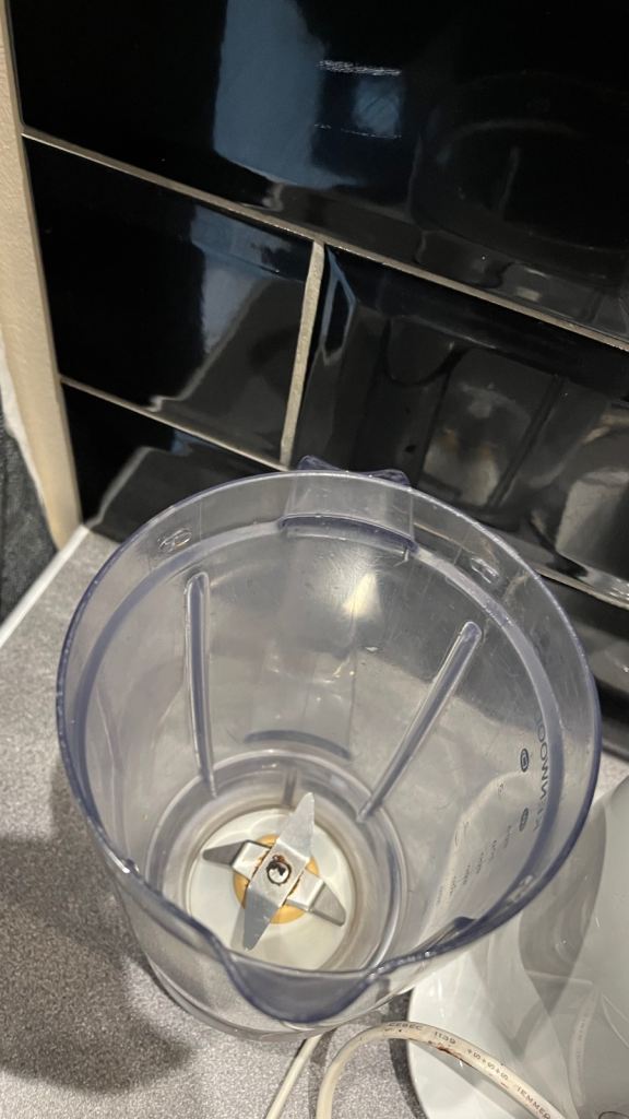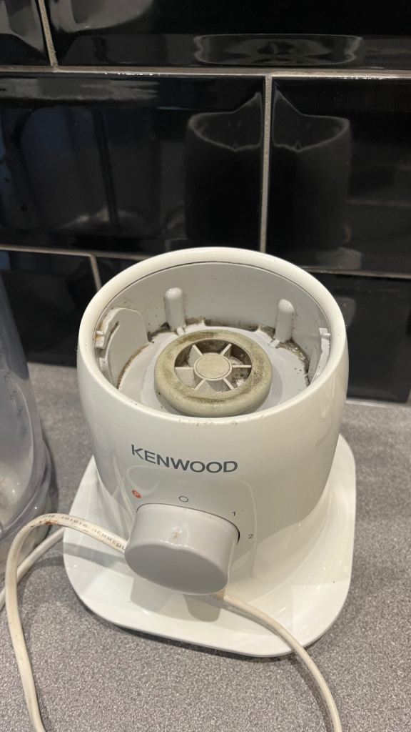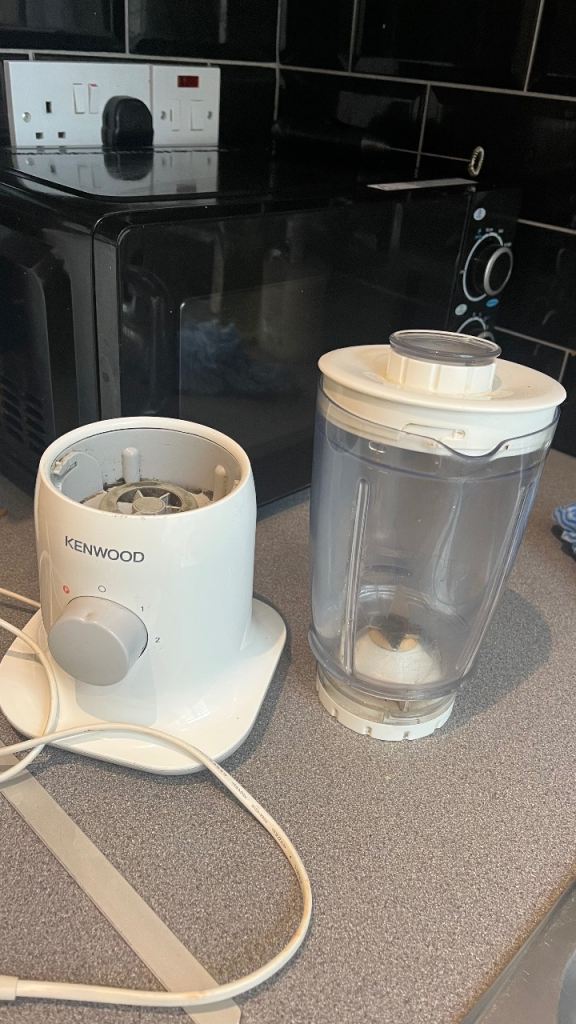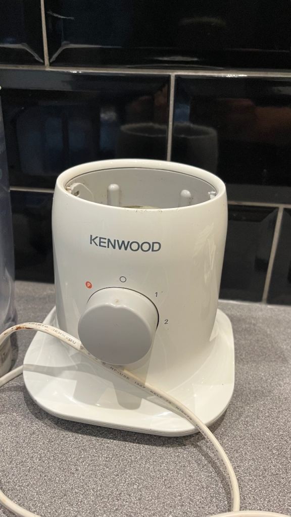 Selling a Kenwood blender with jug and lid included. The blender unit powers on and the control knob works (2 speeds + pulse), but the blades have stopped working, so it is being sold for spare parts or repair.