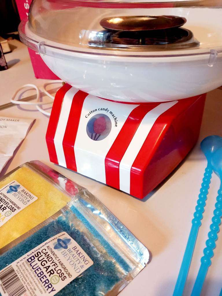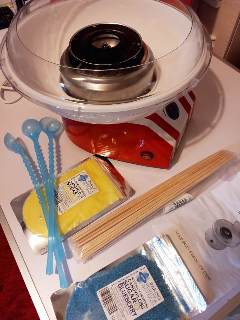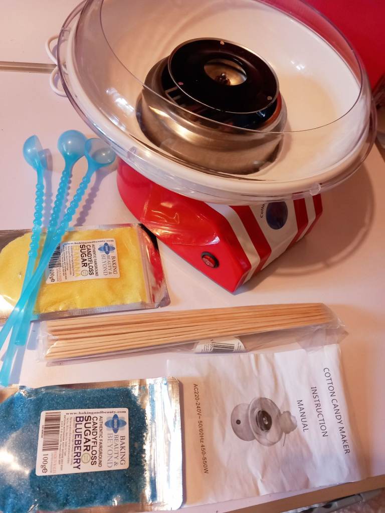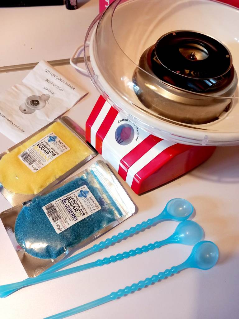 Candy Floss Maker with 2 candy floss sugars, Banana and Blueberry, scoops and sticks.