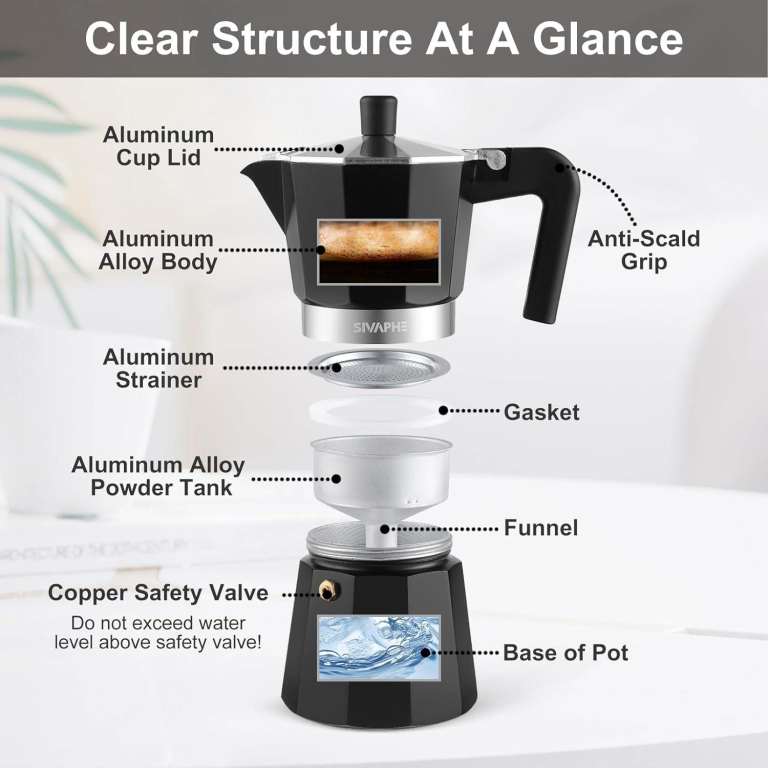 HEAT RESISTANT HANDLE AND BUILT IN COPPER SAFETY VALVE PREVENTING OVERHEATING. IT IS DRIP FREE. DURABLE AND DISHWASHER SAFE, LIGHTWEIGHT, DETACHABLE FILTER