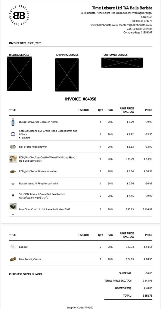 - Purchased from Bella Barista in 2013; serviced by them in October 2025 – new Gicar temperature controller, full descale with new gaskets, springs and cams